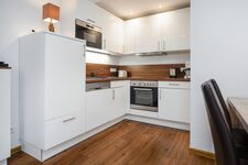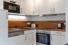 Cerankochfeld, Dunstabzugshaube, Kühlschrank mit Gefrierfach, Essplatz in der Küche