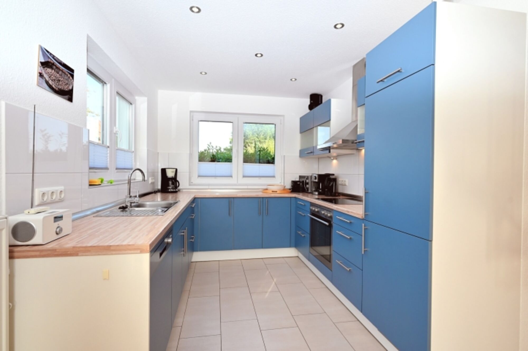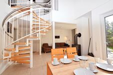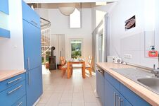 In der voll ausgestatteten Küche mit Mikrowelle, Cerankochfeld, Backofen, Spülmaschine und vielem mehr können Sie mühelos Ihre Lieblingsgerichte zaubern. Der lichtdurchflutete Wohnbereich mit einer großen Fensterfront lädt zum Entspannen ein, während der angrenzende Essbereich Platz für vier Personen bietet.