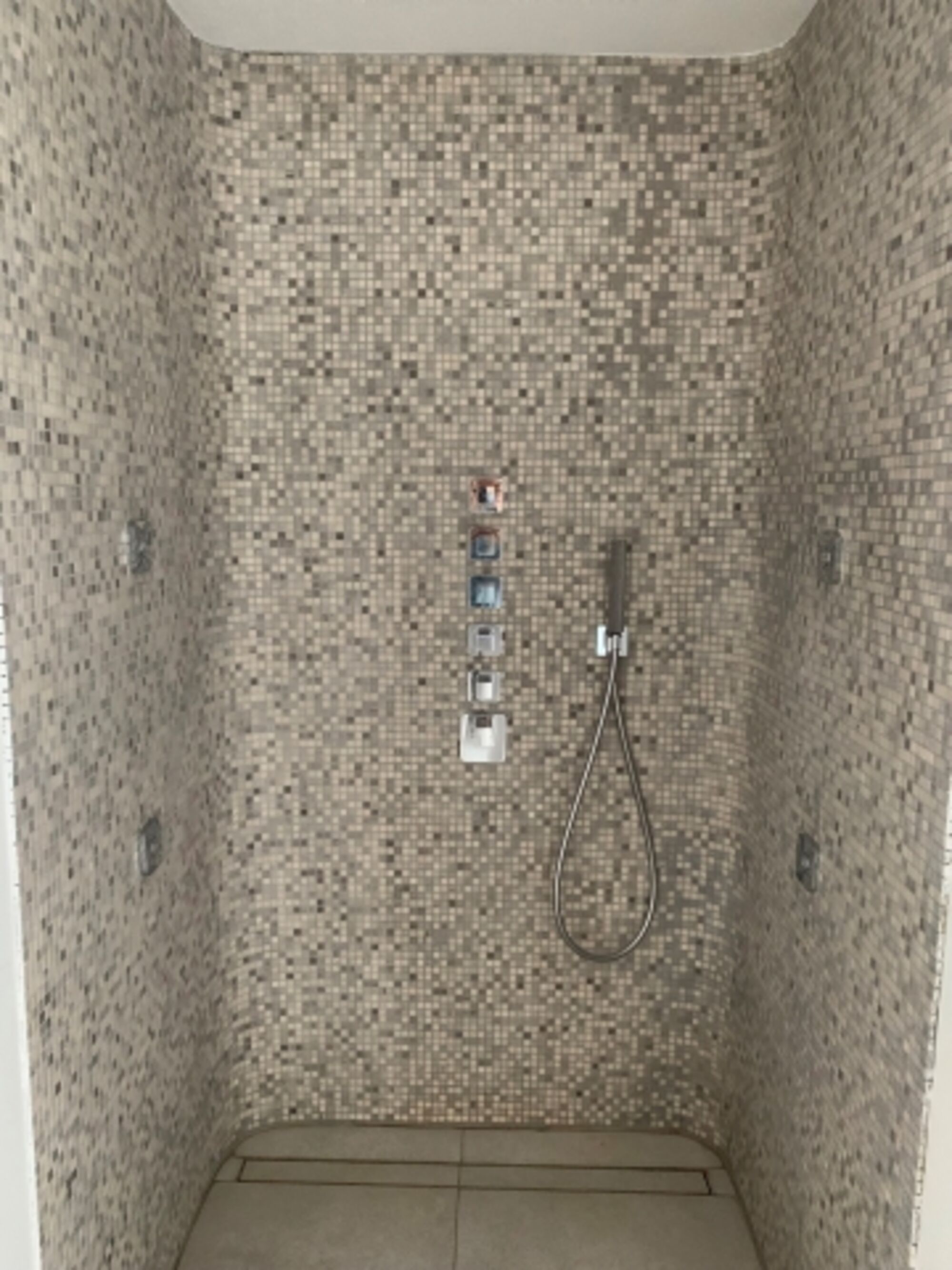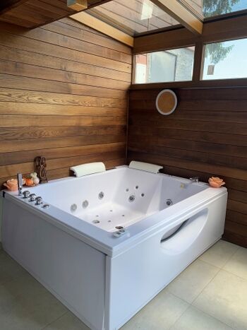 Badewanne mit Whirlpool, Massagedusche, Regendusche, Spiegel