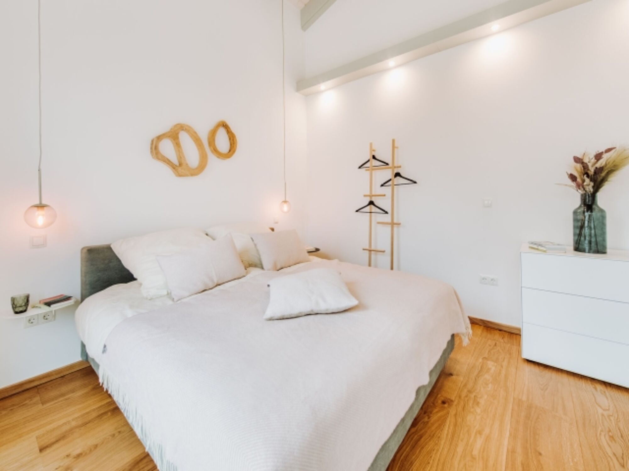 Netflixen in Kuschel-Atmosphäre: Nach einem actionreichen Tag auf Rügens Ostsee-Insel Ummanz kommst du müde, aber glücklich heim. Entweder du schläfst nach so viel frischer Seeluft sofort ein oder gönnst dir noch deine Lieblingsserie zum Ausklang. Ein Smart-TV inklusive Netflix gehören im Schlafzimmer zum Entertainmentpaket. Für die richtige Stimmung dimmst du das Licht. Farbiges Ambientlight sorgt jetzt für eine warme Atmosphäre. Hochwertiges Boxspringbett: Du setzt lieber auf Traum-Kino statt Netflix-Kino? Dann bietet dir das hochwertige, handgefertigte Boxspringbett aus samtigem Cordstoff das perfekte Gute-Nacht-Lager. Kuschel dich ein. Dank Bettzeug in Übergröße ist genug Decke für alle da. Verdunklungsvorhänge: Auf der bequemen Matratze schläfst du erholt aus. Richtig lange. Denn durch die Verdunklungsvorhänge gibt es keine kitzelnden Sonnenstrahlen, die dich am Morgen wecken. Reisebett für Kleinkinder: Falls dich etwas am Morgen weckt, ist es ein anderer Sonnenschein: dein Hund oder dein Kind. Für dein Kleinkind stellen wir dir übrigens ein Reisebett parat. Matratze, Schlafsack, Bettzeug und Schnuffeltier? Bringe bitte mit. Knitterfreie Kleidung: Die Garderobe sorgt für glatte Hemden und Hosen. Zusätzlich findet in einer großen Kommode deine restliche Kleidung Platz. Und für alle, die es besonders bequem mögen: Der kuschelige Loungesessel macht sich perfekt als „Kleiderstuhl“. Große Möbel-Design-Liebe: Die Ferienwohnung FISCHER:IN überzeugt mit echtem Wohnfühl-Ambiente und Möbeln der Marken: Schramm Werkstätten, BoConcept, Bolia, piure sowie kommod. Doppelbett 1,80 x 2,00m, Boxspringbett, Kommode, Leselampe am Bett, Fliegengitter