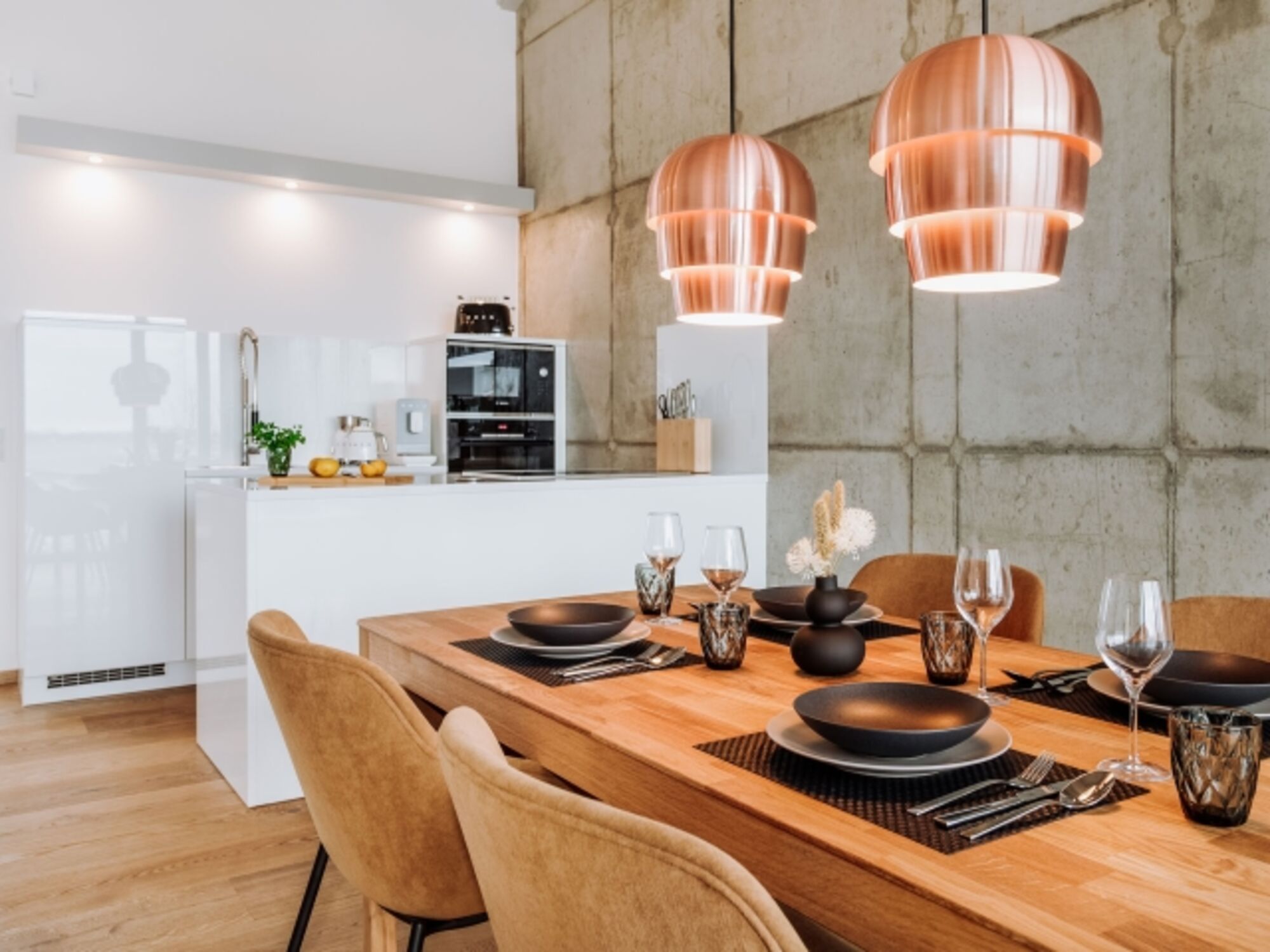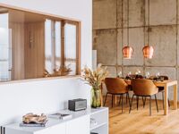 Ein weiteres Highlight ist die geschmackvolle, offen gestaltete Küche. Ein großer Holztisch sowie bequeme Stühle bieten Platz für den gemeinsamen Genuss. Mit ihrer umfassenden Ausstattung sorgt die Küche der FISCHER:IN für überschäumende Freude bei Hobbyköch:innen. Hier findest du einen Herd mit Backofen und Ceranfeld, eine Kaffeemaschine, einen Geschirrspüler, eine Kühl-Gefrierkombination, eine Mikrowelle, diverse Kleingeräte und alles, was du zum Kochen benötigst.