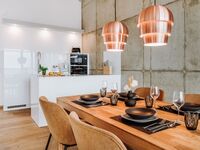 4-Platten Herd, Cerankochfeld, Induktionsherd, Dunstabzugshaube, Kühlschrank mit Gefrierfach, Kaffeevollautomat, Mixer, Korkenzieher / Flaschenöffner, Gewürze (Salz, Pfeffer, Zucker), Geschirrhandtücher, Mülltüten, Essplatz in der Küche