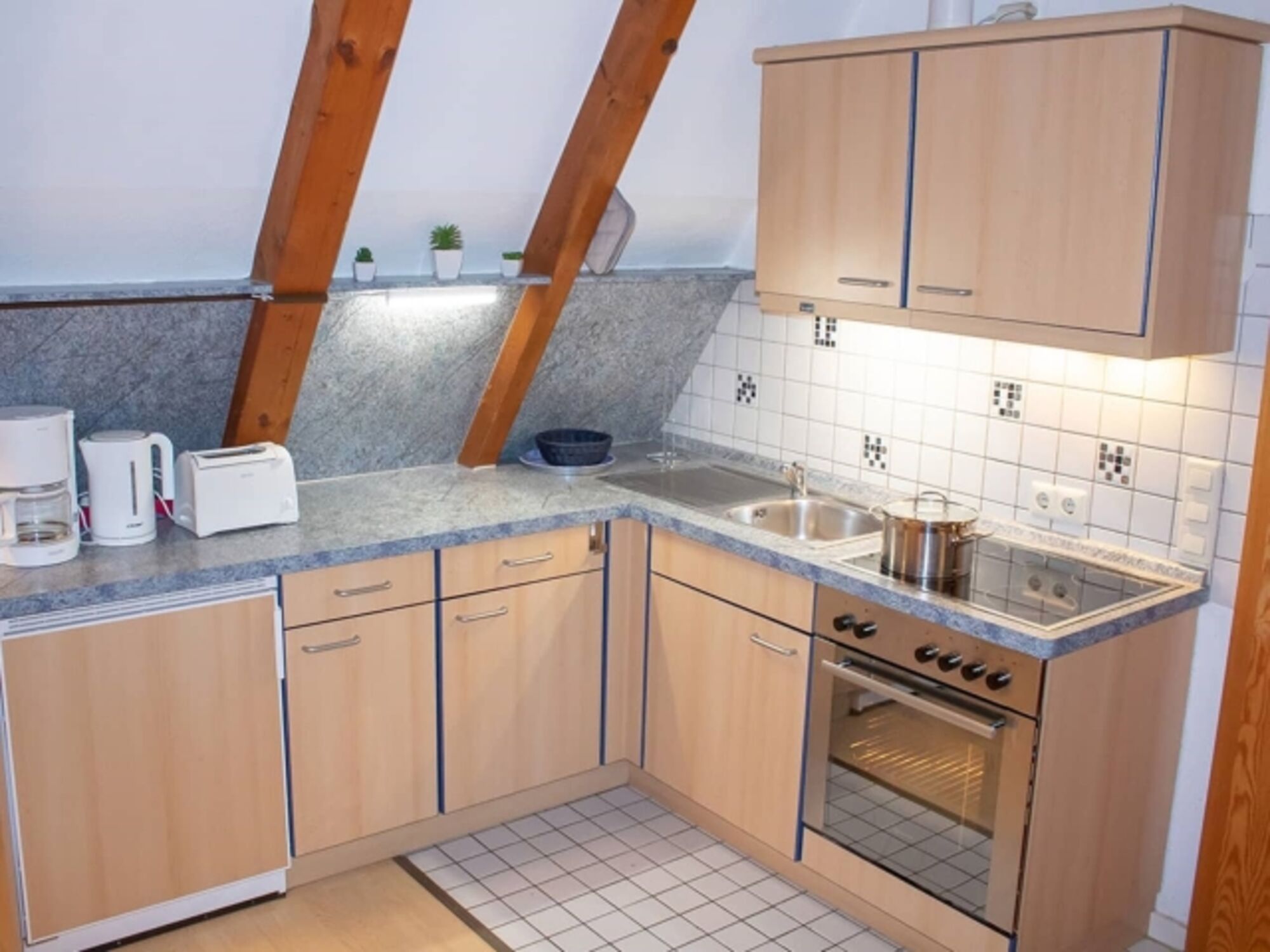 4-Platten Herd, Cerankochfeld, Dunstabzugshaube, Kühlschrank mit Gefrierfach, Nespresso-Automat, Korkenzieher / Flaschenöffner, Essplatz in der Küche