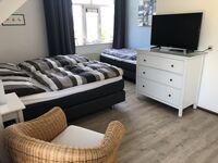 Es gibt ein Boxspringbett 180 x 200 cm. Der 3 Schlafplatz ist ein hochwertiger Dauerschlafsessel der Firma Verholt und kann bei Bedarf als 10. Schlafplatz genutzt werden. Liegefläche circa 190 x 80 cm. Balkon Doppelbett 1,80 x 2,00m, Einzelbett, Boxspringbett, Kommode, Spiegel, Leselampe am Bett