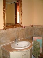 Waschbecken, Regendusche, Spiegel, Fenster im Bad, Bidet, Fliegengitter