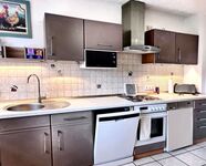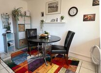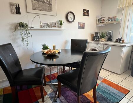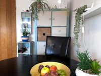 Sehr gut ausgestattete Küche mit zusätzlicher Cafissimo, Essbereich mit Lan-Dose, Wlan. Reichlich Geschirr, Besteck, Töpfe, Pfannen. Kaffee, Tee, und ein Willkommensgetränk nach Wahl im Kühlschrank. Leckerchen für den Vierbeiner.