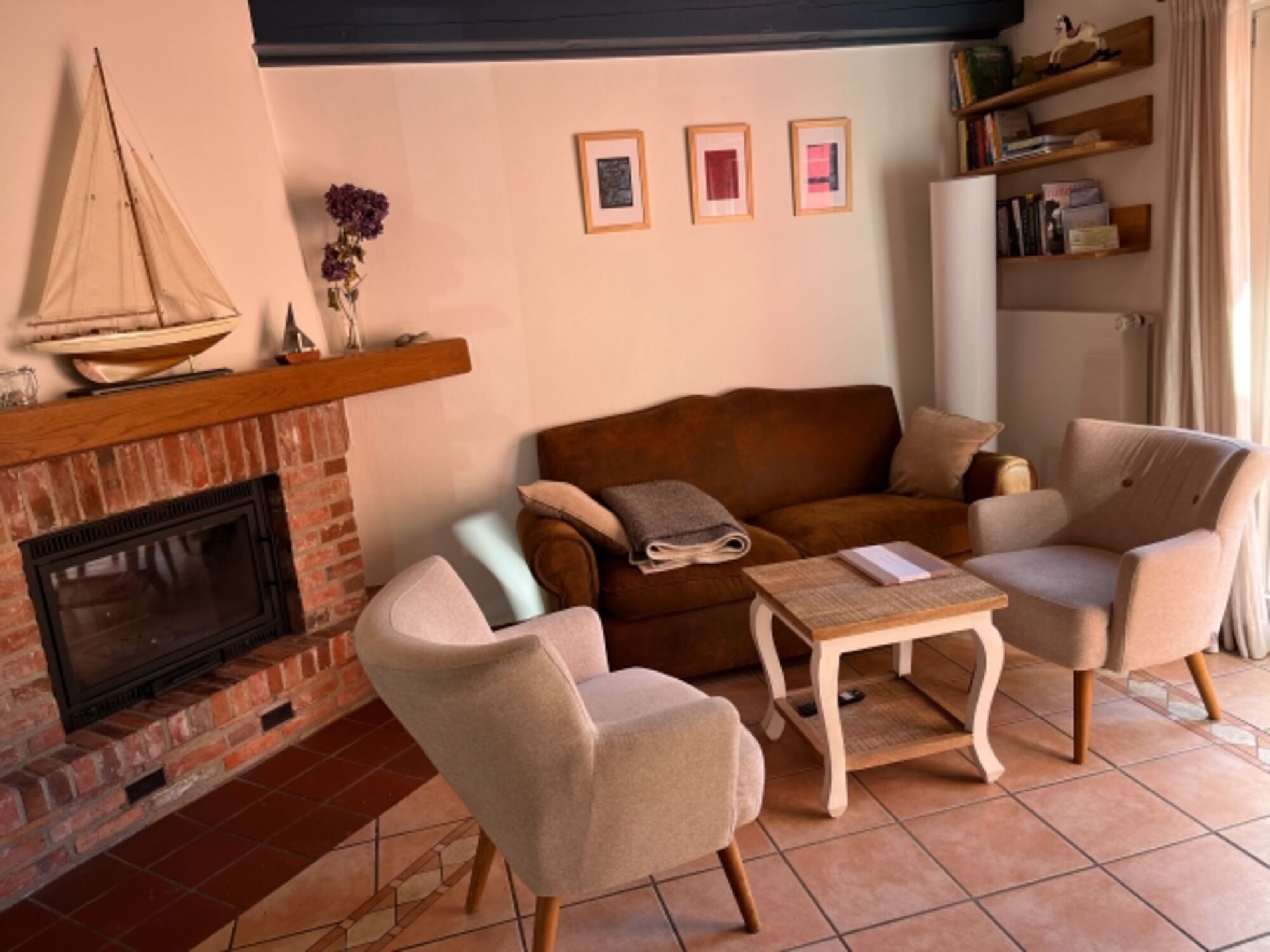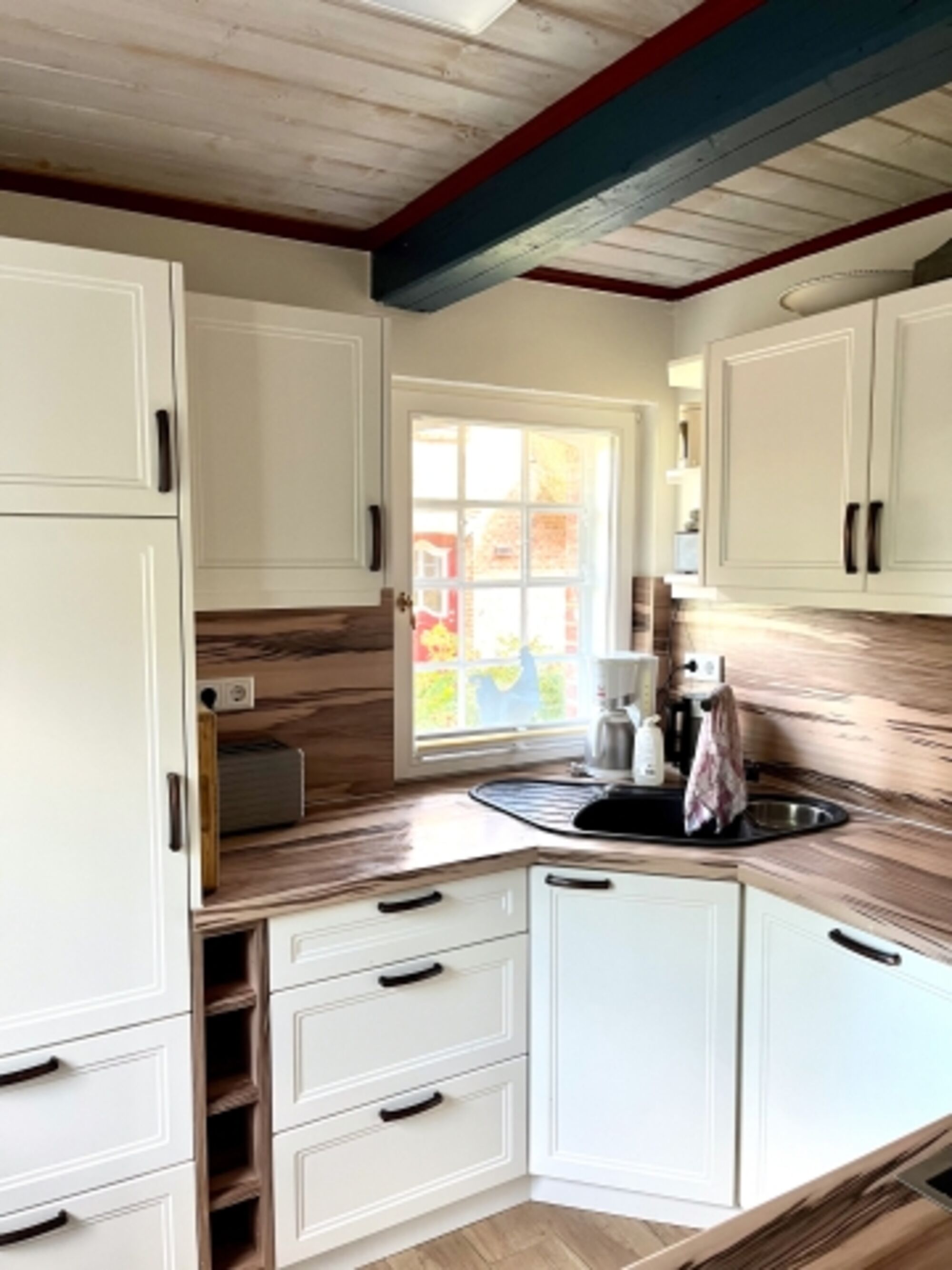Diese gemütliche und helle Friesenwohnung bietet im Erdgeschoss einen großen Wohnraum mit Kamin und Essplatz.