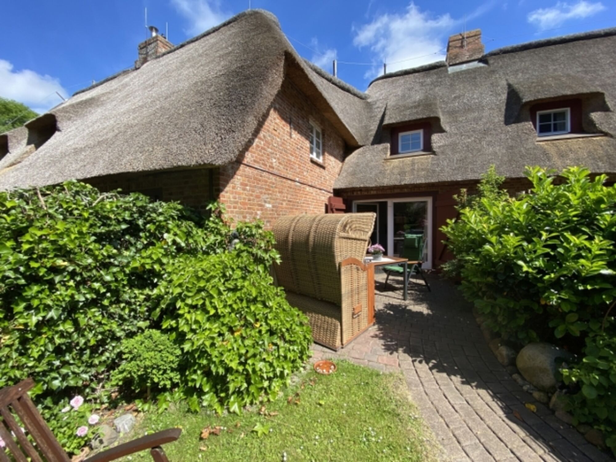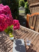 Von dort hat man einen direkten Zugang zu einem kleinen, abgeteilten romantischen Garten mit Strandkorb und Gartenmöbeln. Die eingezäunte Terasse wird durch ein Törchen begrenzt, was es besonders für Familien mit kleinen Kindern und Hundebesitzer attraktiv macht.