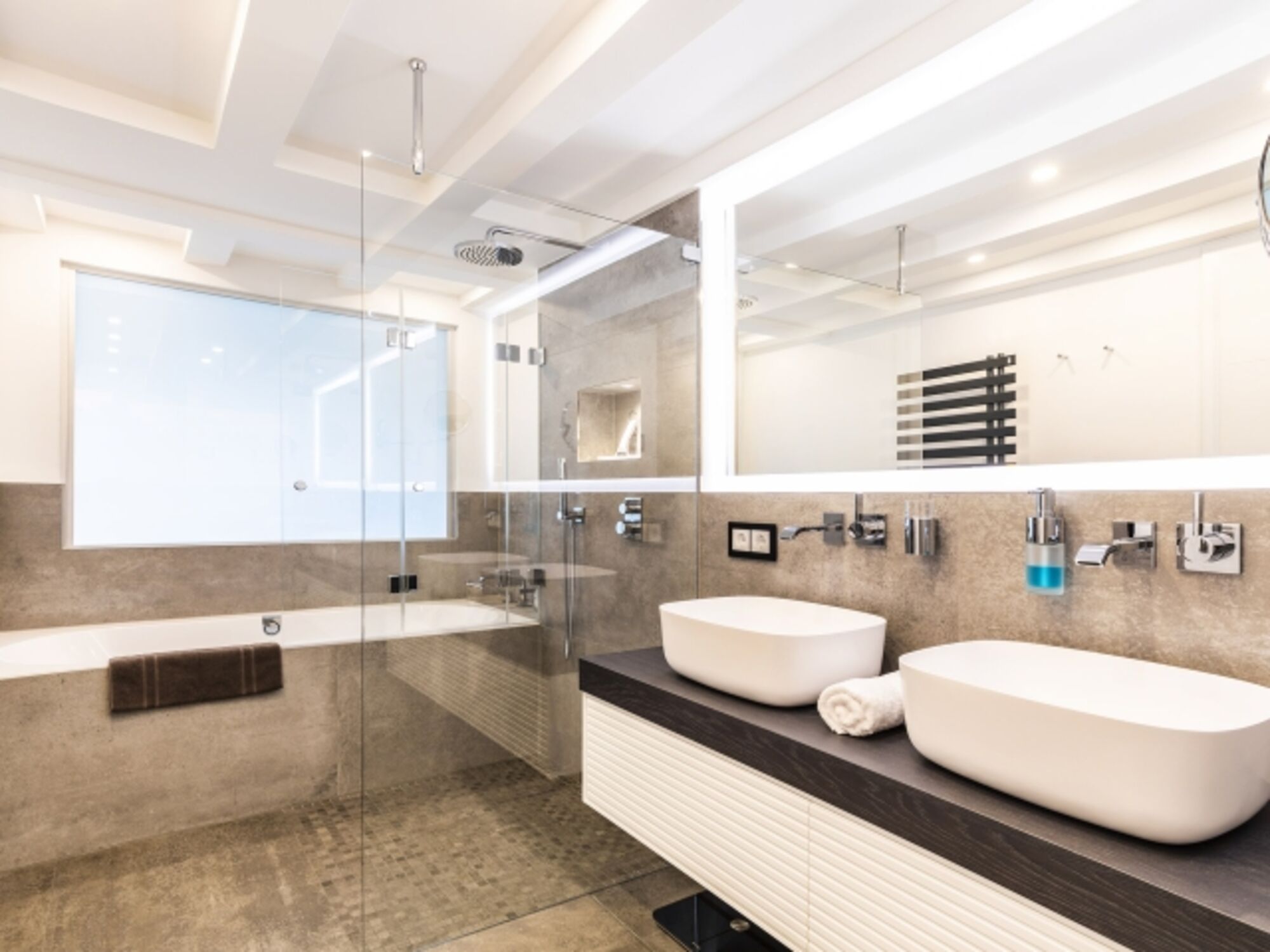 Waschbecken, Regendusche, Spiegel