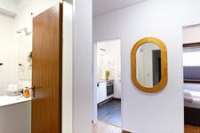 Einzelbett, Boxspringbett, Kommode, Spiegel, Leselampe am Bett, Fliegengitter