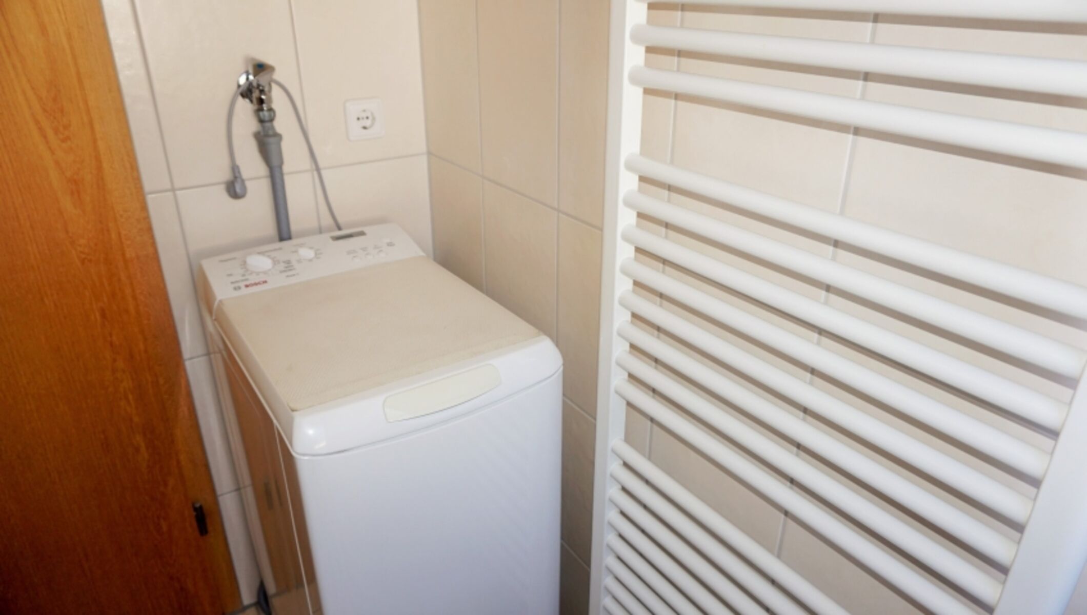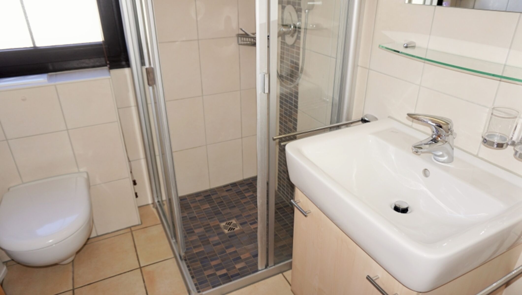 Das helle Duschbad mit Tageslicht hat eine Dusche mit fast ebenerdigem Einstieg. Dazu ein Waschbecken mit Unterschrank, ein Hänge WC und einen Handtuchheizkörper. Dieses Haus hat sogar eine eigene Waschmaschine, so dass Sie völlig unabhängig von den Öffnungszeiten des allgemeinen Waschhauses sind.