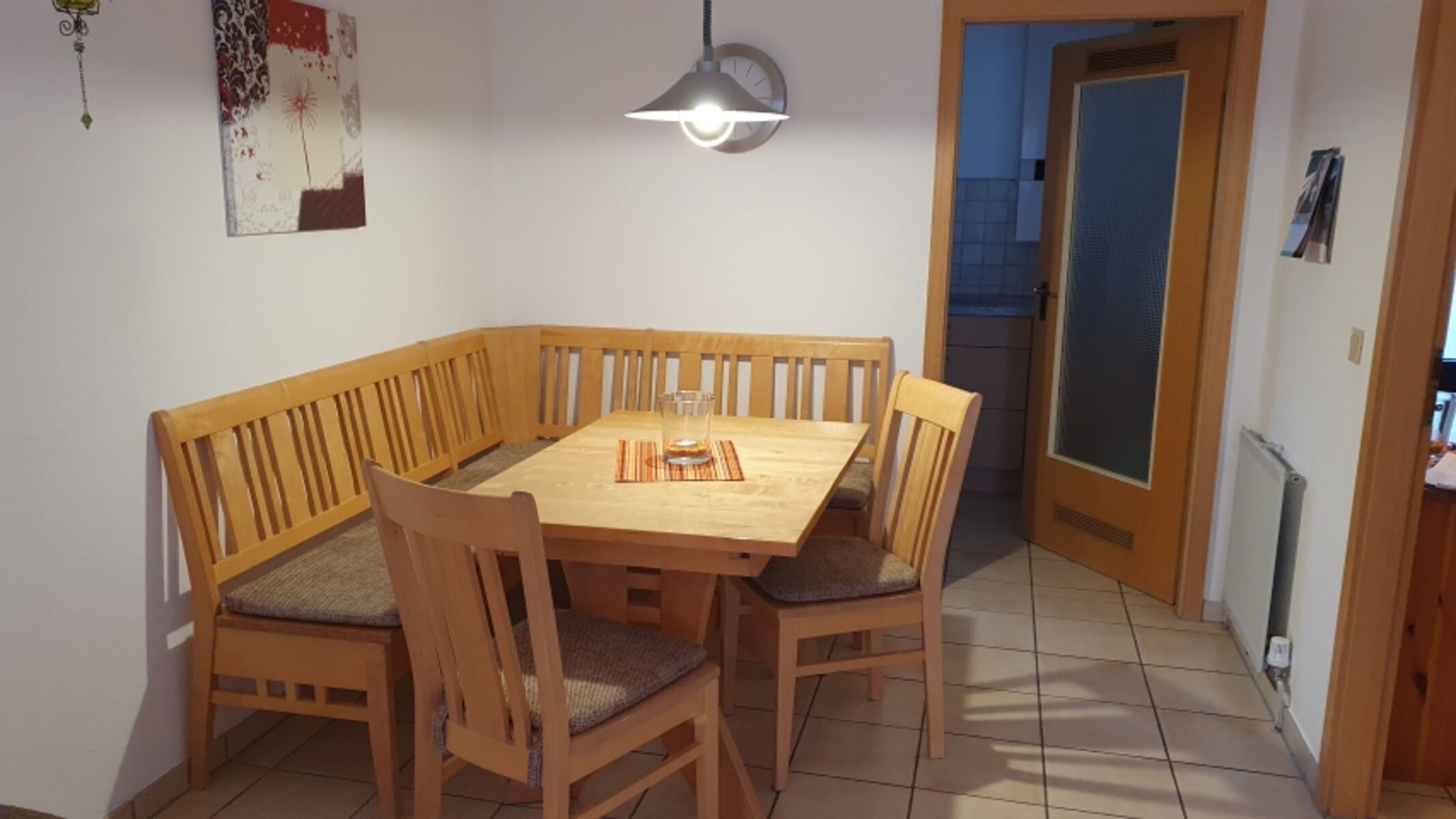 In den Wohnbereich integriert ist die Essecke. Eine hochwertige Holzeckbank mit Ausziehisch und Stühlen und genug Platz für alle Gäste.