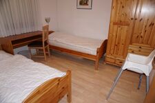 Im kleineren Schlafzimmer befinden sich zwei Einzelbetten, ein Kleiderschrank und ein Schreibtisch mit Stuhl.
