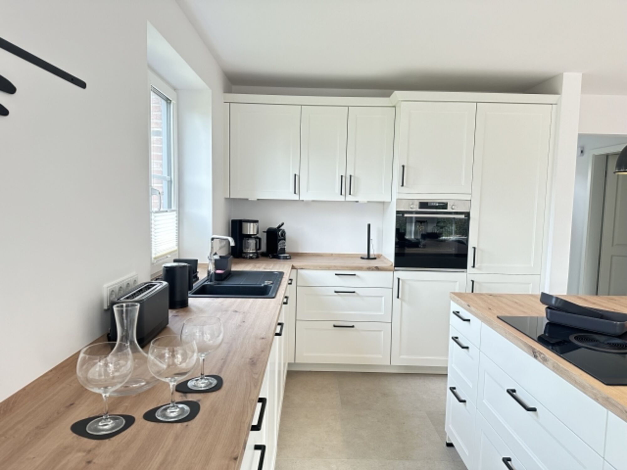 Cerankochfeld, Induktionsherd, Gefrierschrank, Essplatz in der Küche