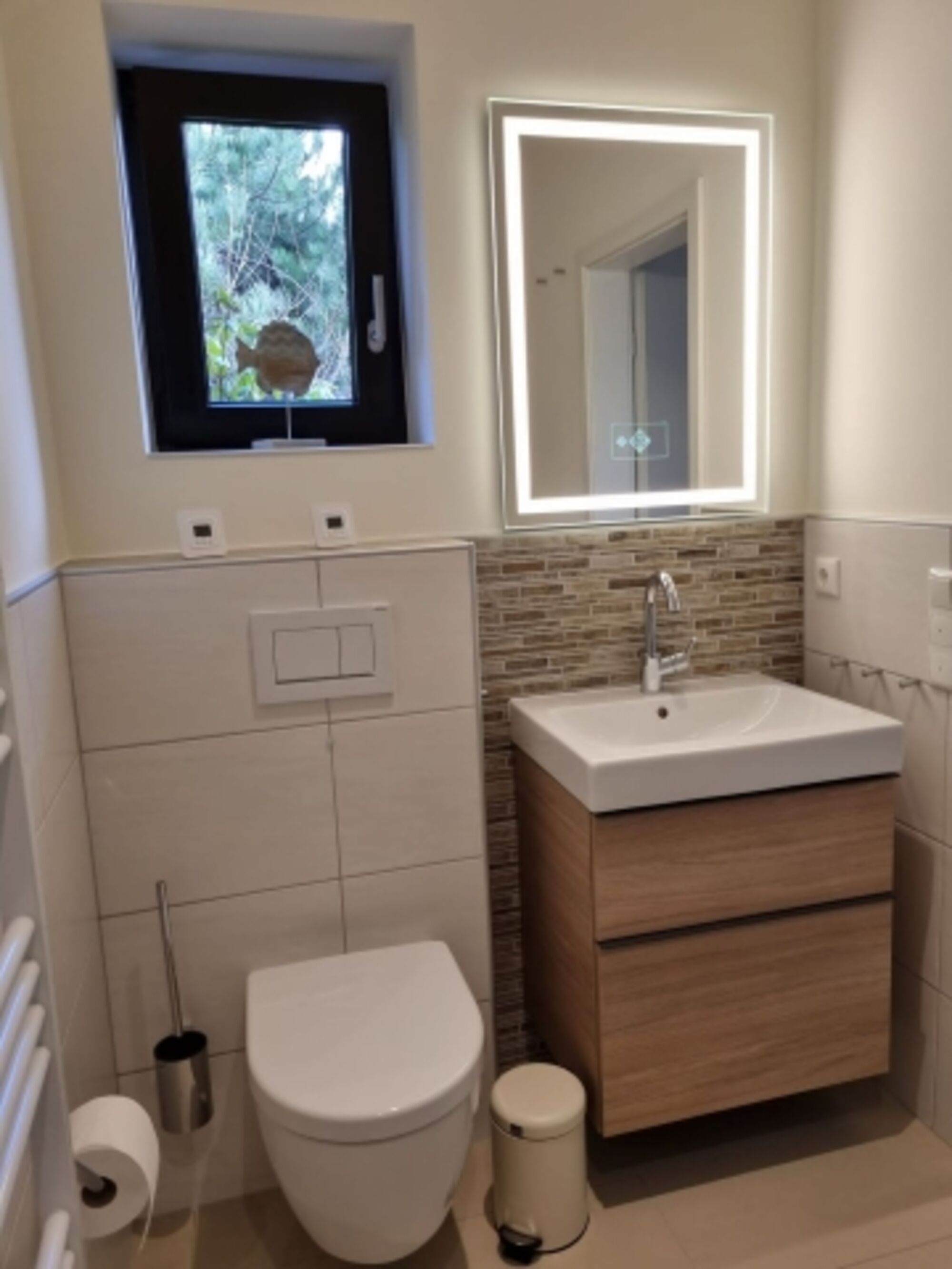Waschbecken, Spiegel, Fenster im Bad
