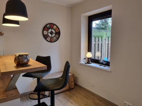 Das Haus ist ebenerdig, bietet ca. 58 m² Wohnfläche und wurde 2023 umfassend modernisiert. Es erwartet Sie ein stilvoller Wohn- und Essbereich mit Kaminofen und gut ausgestatteter Küche inklusive Geschirrspüler, Herd sowie einer Mikrowelle mit integriertem Backofen. Sat-TV ist ebenfalls vorhanden.