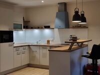 Induktionsherd, Dunstabzugshaube, Kühlschrank mit Gefrierfach, Mülltüten, Essplatz in der Küche