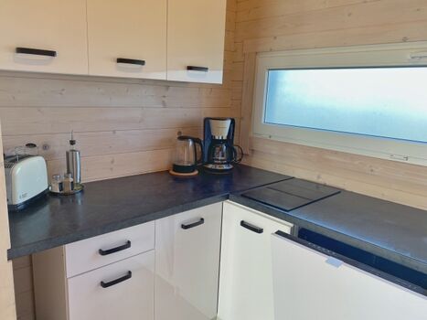2-Platten Herd, Induktionsherd, Kühlschrank mit Gefrierfach, Gefrierschrank, Gewürze (Salz, Pfeffer, Zucker), Geschirrhandtücher, Mülltüten