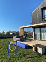 – Agility-Parcours, Wiesenfläche, Hundehütte, Näpfe und Körbchen