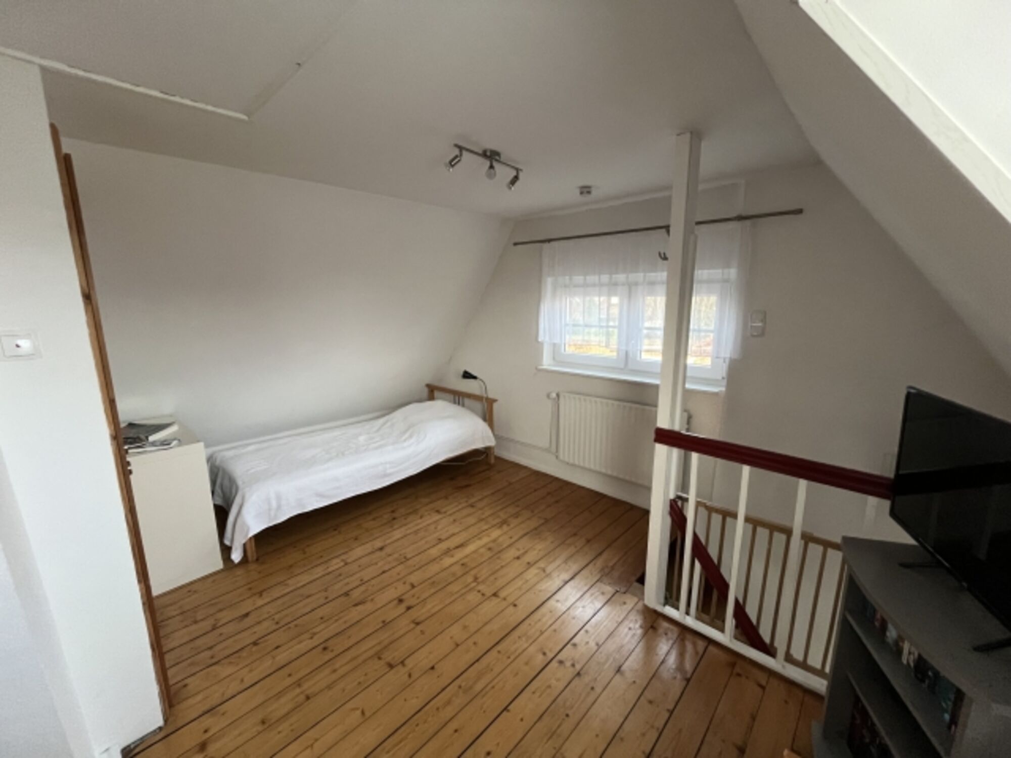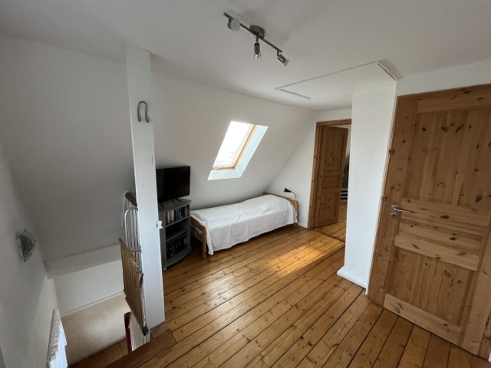 Die Empore im Obergeschoß ist mit zwei Einzelbetten und einem Fernseher ausgestattet. Das angrenzende Schlafzimmer verfügt über ein Doppelbett. Gäste WC ist auf dieser Etage selbstverständlich auch vorhanden.
