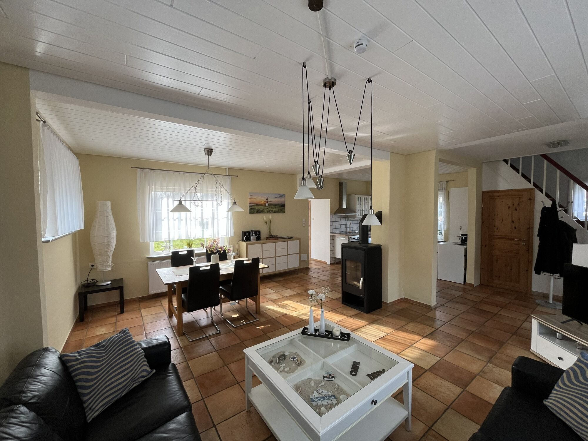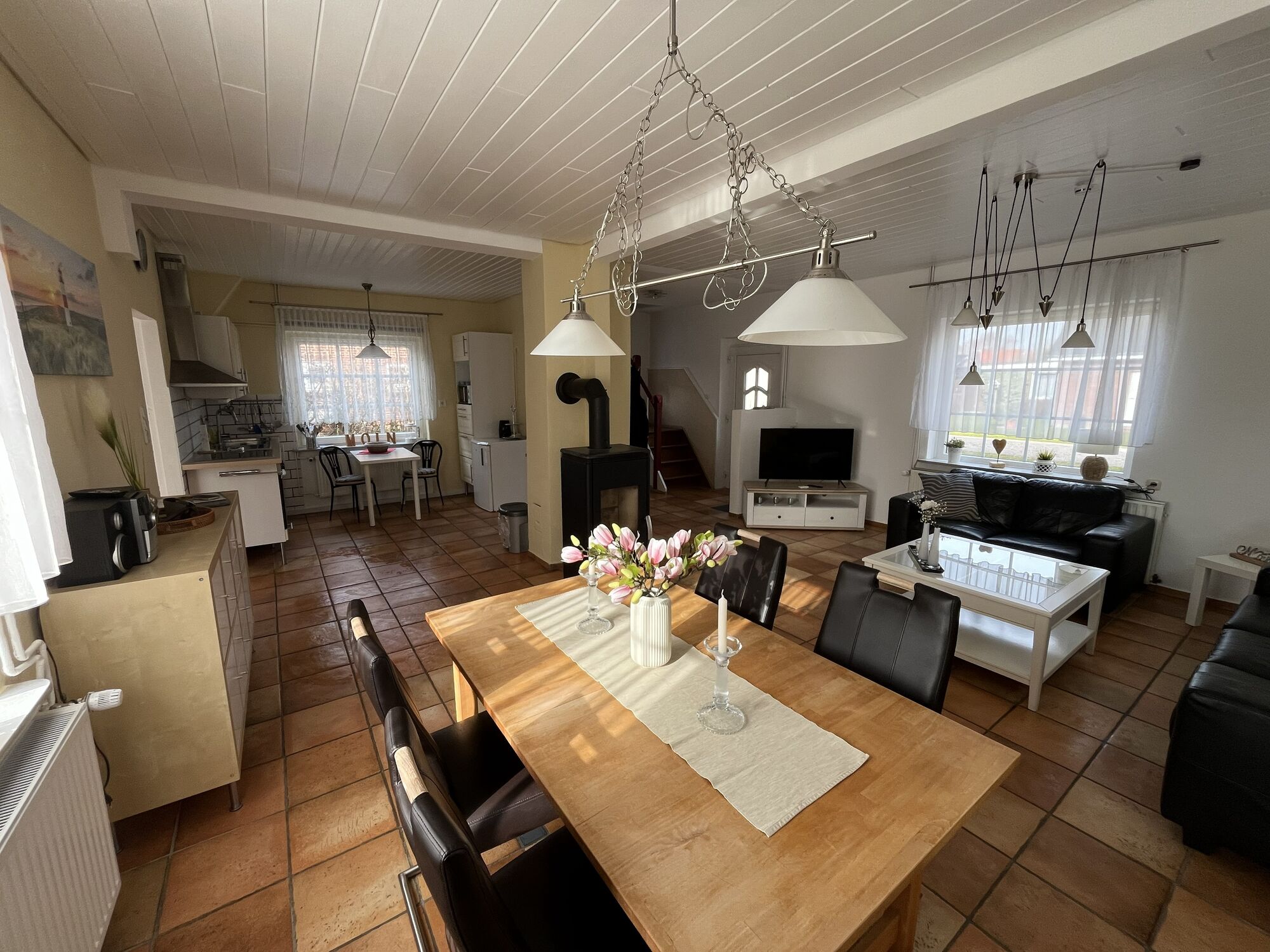 Im Erdgeschoss befindet sich das Wohnzimmer mit angrenzendem Esszimmer und Übergang zur Küche. Vor dem Kaminofen können Sie bei kühlerem Wetter wunderbar entspannen.