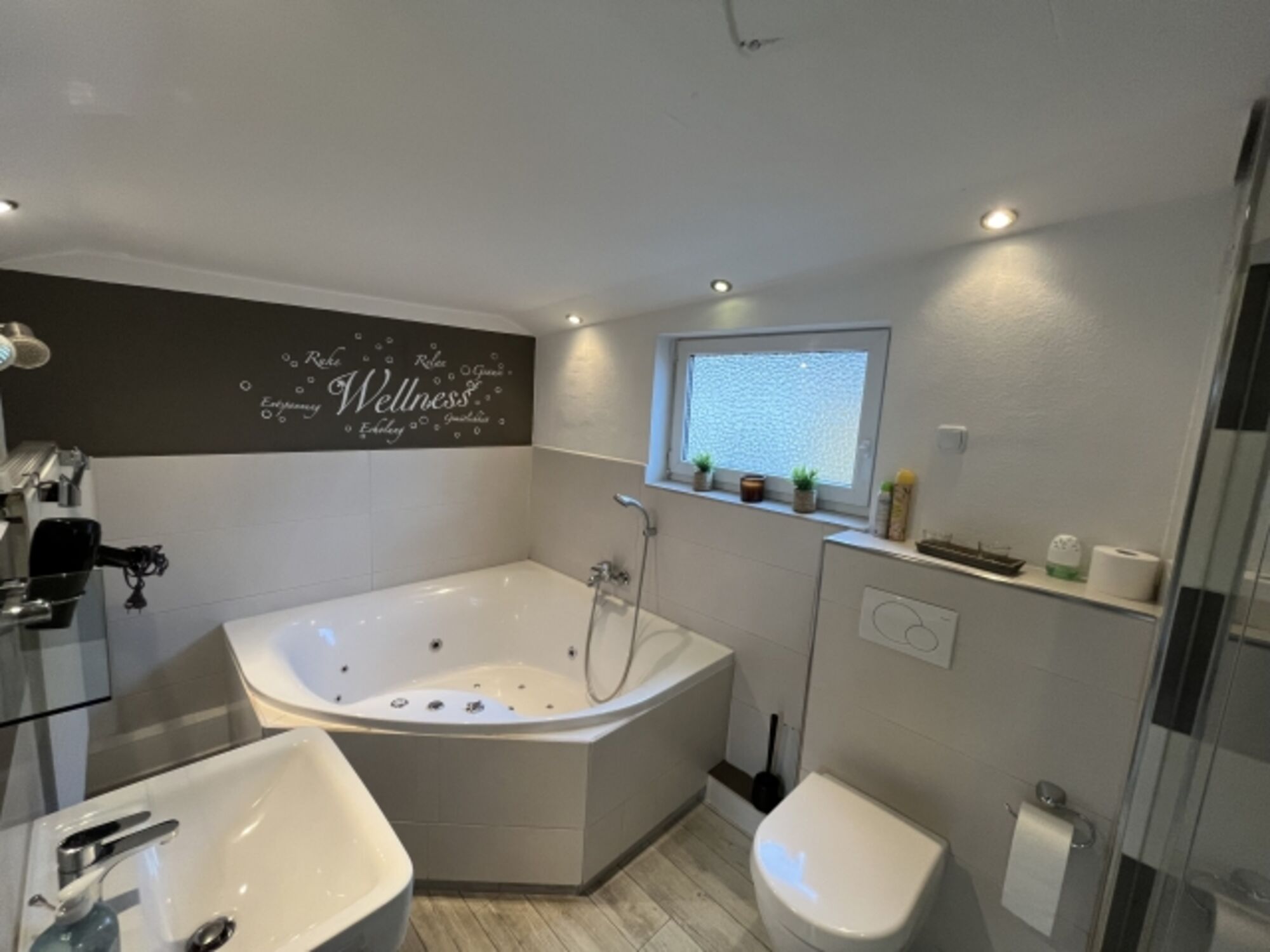 Badewanne mit Whirlpool, Waschbecken, Massagedusche, Regendusche, Spiegel, Fenster im Bad, Fliegengitter