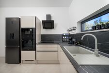 4-Platten Herd, Induktionsherd, Kühlschrank mit Gefrierfach, Gefrierschrank, Geschirrhandtücher, Essplatz in der Küche