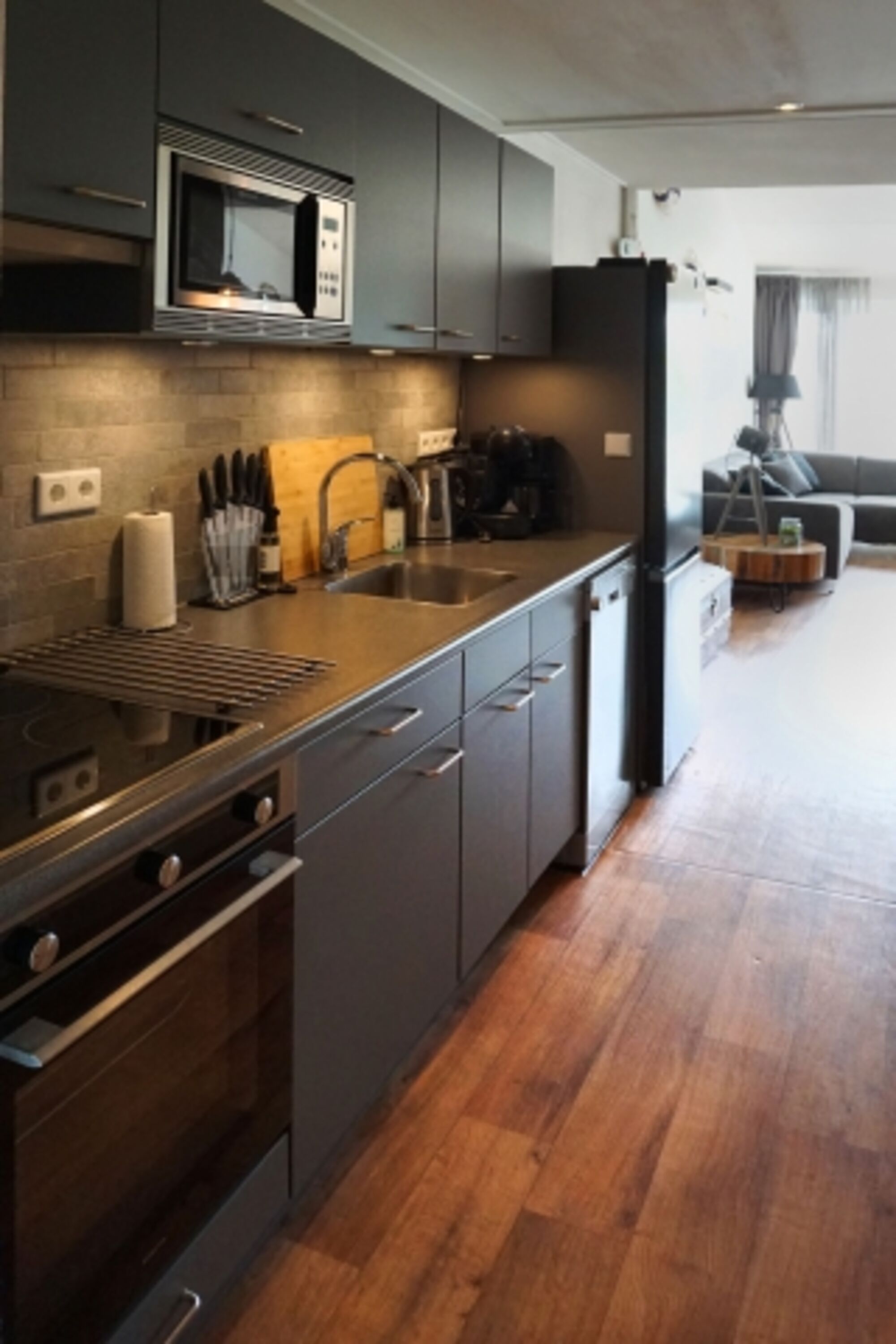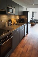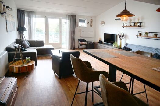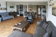 Die Küche ist mit einem Geschirrspüler, einem Induktionskochfeld, einer Mikrowelle und einem Kühlschrank mit Gefrierfach ausgestattet. Im Wohnbereich finden Sie links einen gemütlichen Esstisch mit 4 Stühlen und am Ende eine schöne Sitzecke mit einem bequemen Sofa und Sessel. Durch die beiden Terrassentüren gelangen Sie außerdem auf den Balkon, auf dem Sie bis in die frühen Morgenstunden die Sonne genießen können.