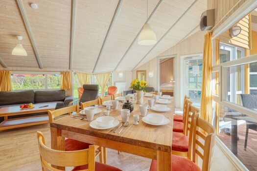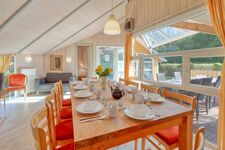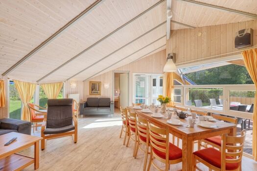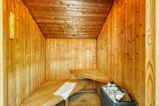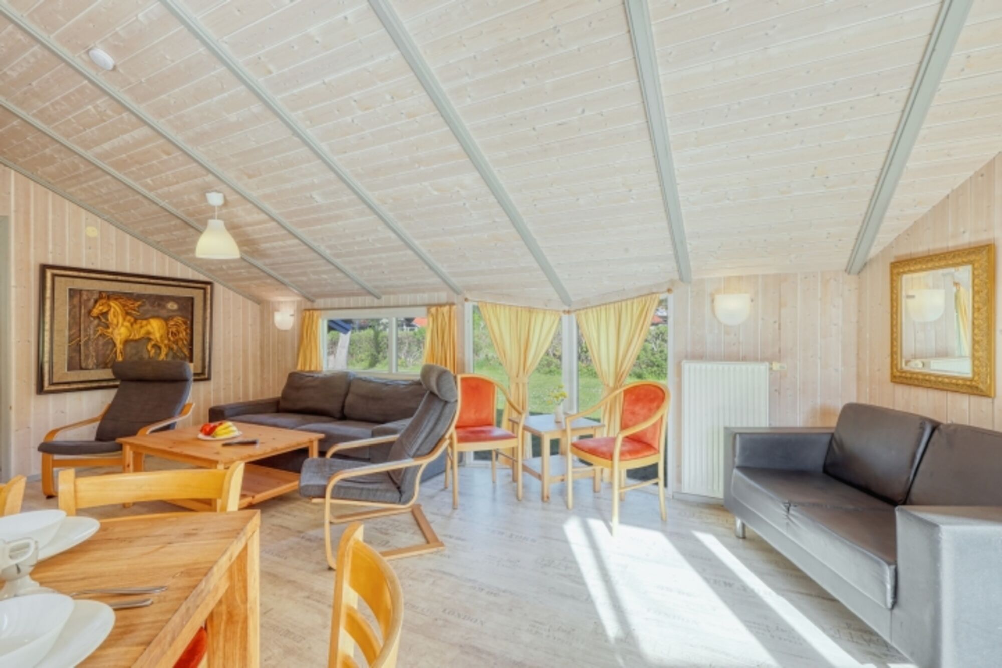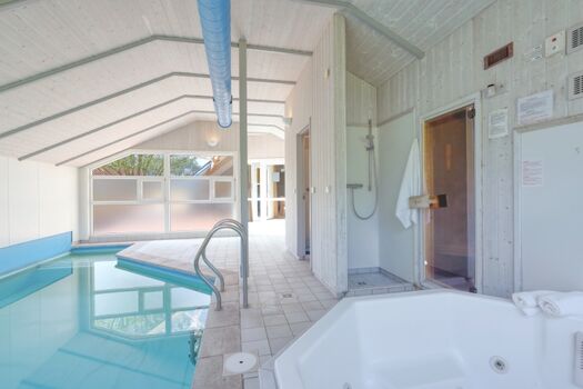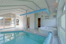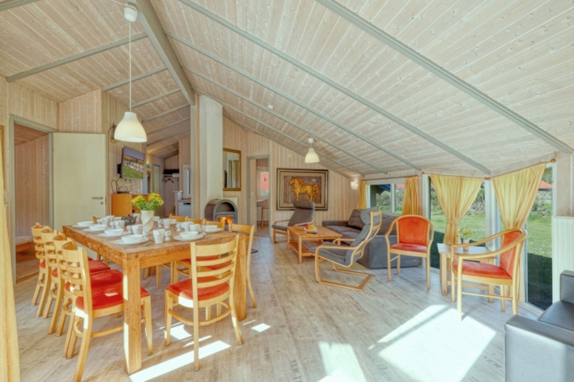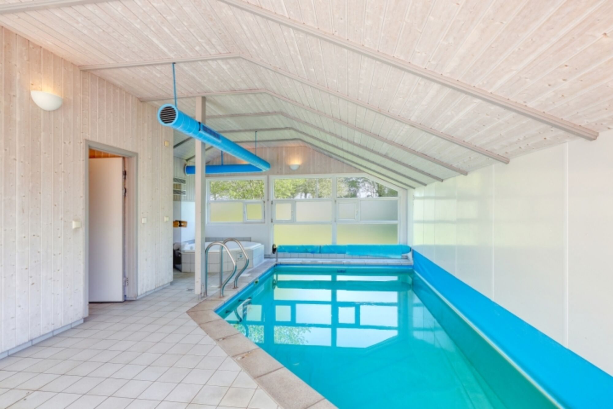 Unser skandinavisches Ferienhaus ist für zehn Personen ausgelegt, die in fünf Schlafräumen unterkommen, wobei sich zwei der Schlafzimmer vorzugsweise für Kinder eignen. Das großzügig bemessene Wohn-Esszimmer ist mit TV und einem dänischen Kaminofen ausgestattet. Vom Eingang aus gelangt man in die Küche. Vom Wohnzimmer aus geht es einerseits zum Indoor-Pool als auch auf die teilweise überdachte Terrasse mit den Gartenmöbeln und Sonnenliegen. Für Kinder findet man vor dem Haus eine Schaukel. Die Terrasse lässt sich für Hunde absperren.