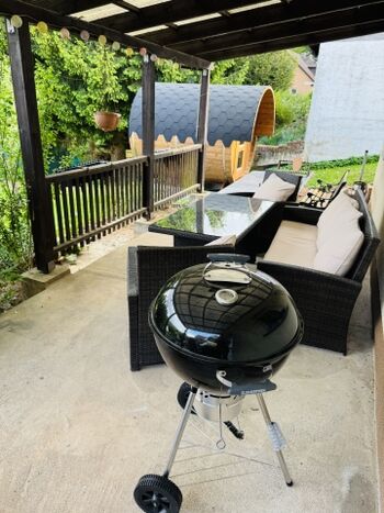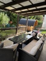 Liegewiese, Gartenmöbel, Kohlegrill, Sauna im Garten