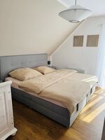 Das Ferienhaus verfügt über zwei komfortable Schlafzimmer, ein Kinderbett (70x140 cm) im großen Schlafzimmer sowie ein Boxspringbett. Kinderreisebett und einen Hochstuhl, sodass auch die kleinen Gäste bestens versorgt sind. Ein Schlafzimmer mit einer Bettengröße von 140x200m. Ein Schlafsofa im Wohnzimmer bietet zusätzliche Schlafmöglichkeiten für 2 Personen.