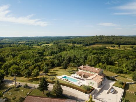 Ferienhaus mit Pool und umgeben von viel Grün