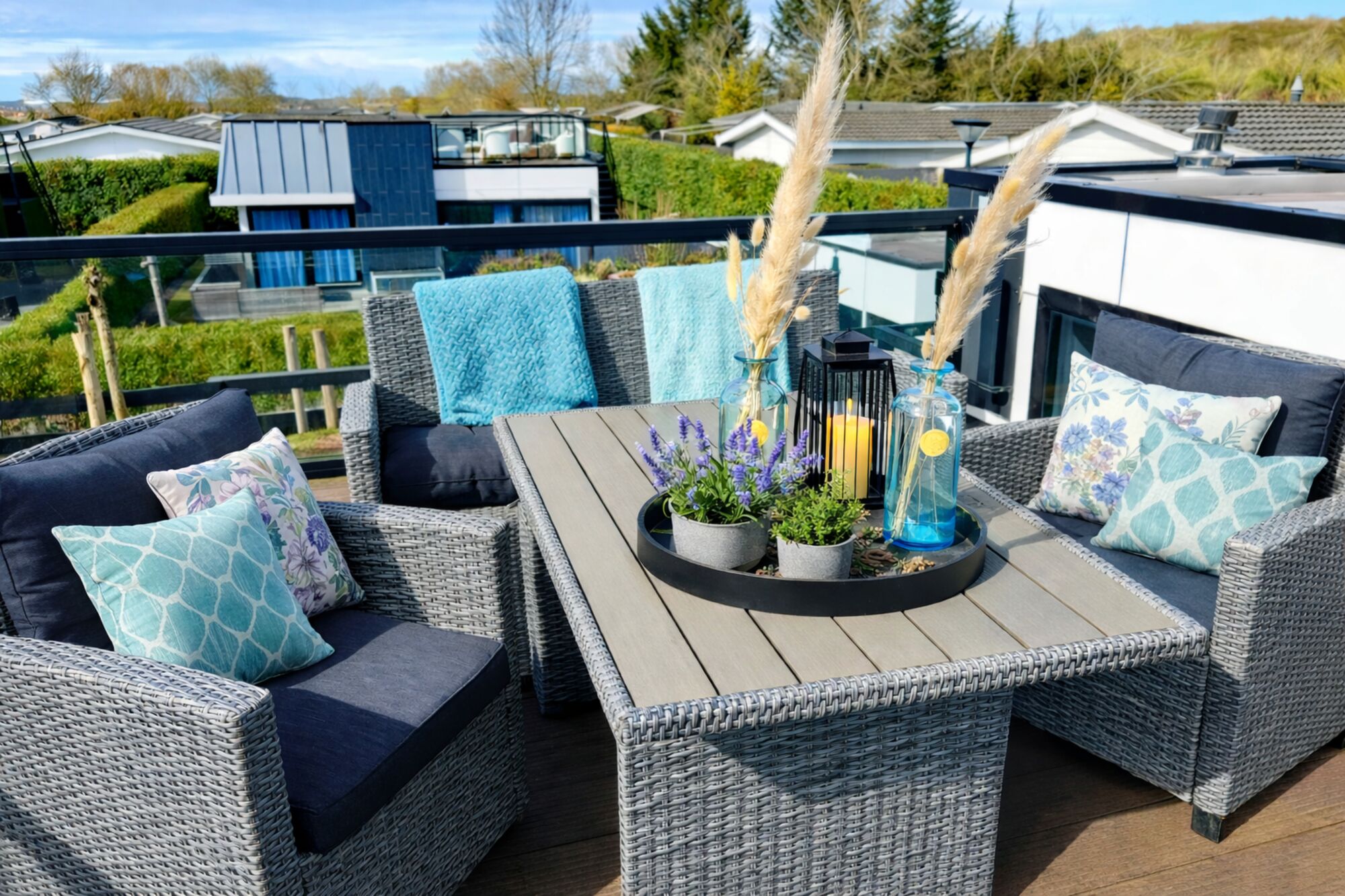 Liegewiese, Gartenmöbel, Außenkamin, Markise