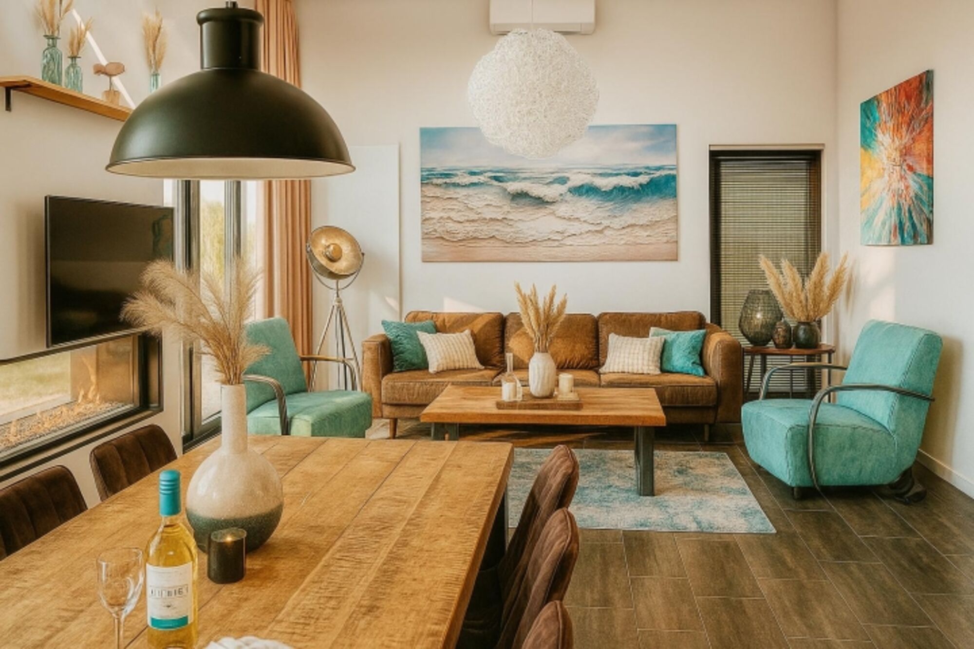 Im Chalet First Line genießt ihr einen hellen, offenen Wohn- und Essbereich mit einem gemütlichen Gaskamin – ideal, um nach einem Tag am Meer die Füße hochzulegen.