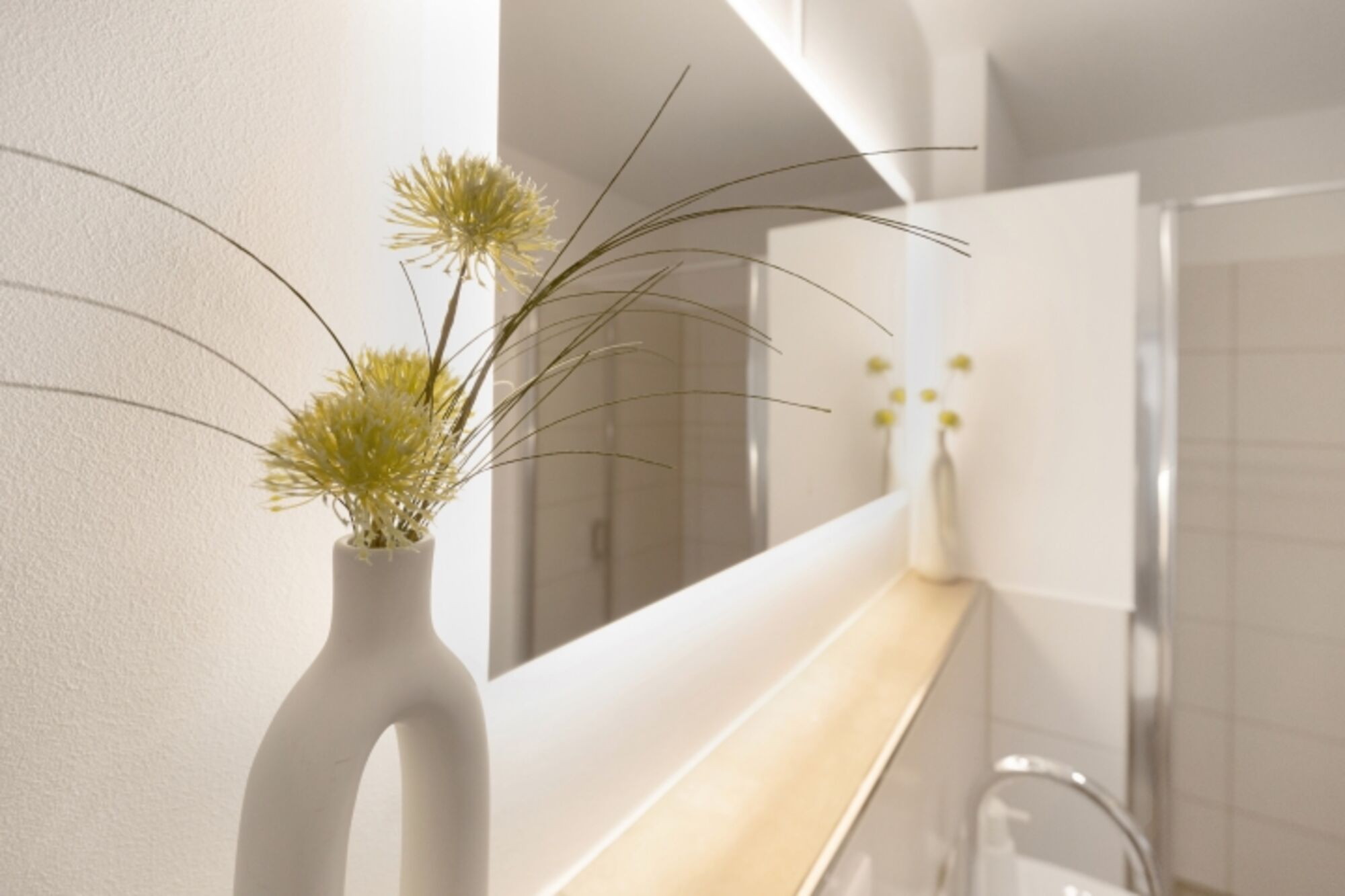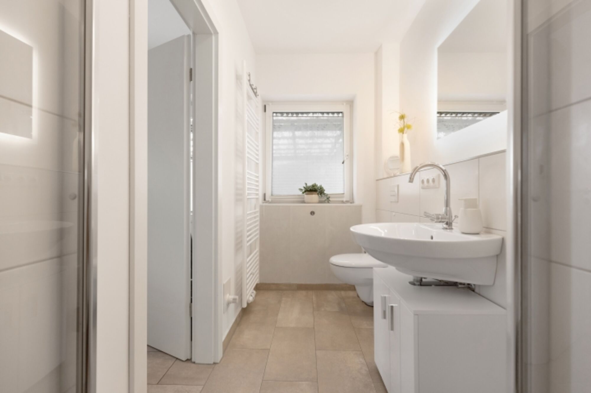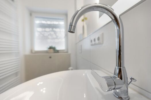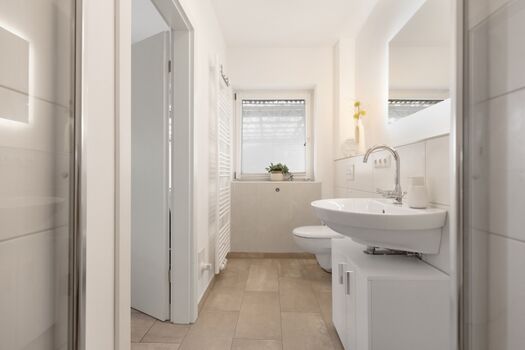 In unserem modernen Gäste-WC erwartet Sie ein stilvolles und funktionales Design, das sowohl Komfort als auch Eleganz vereint. Der Raum ist hell und einladend gestaltet, mit klaren Linien und einer schlichten Farbpalette, die eine entspannende Atmosphäre schafft. Das große Waschbecken aus hochwertigem Material ist nicht nur praktisch, sondern auch ein echter Blickfang. Es bietet ausreichend Platz für alle notwendigen Utensilien und ist mit einem modernen, eleganten Wasserhahn ausgestattet. Direkt über dem Waschbecken befindet sich ein beleuchteter Spiegel, der nicht nur für optimale Lichtverhältnisse beim Frisieren oder Schminken sorgt, sondern auch den Raum optisch vergrößert. Die sanfte Beleuchtung des Spiegels schafft eine angenehme Stimmung und sorgt dafür, dass Sie sich jederzeit wohlfühlen. Ein großes Fenster lässt viel Tageslicht herein und sorgt für eine frische Brise. Die Aussicht ins Freie bringt die Natur ins Innere und lässt den Raum lebendig wirken. Zudem ist das Fenster mit einer Jalousie ausgestattet, die Privatsphäre bietet, wenn dies gewünscht ist. Die Wände sind in sanften, neutralen Tönen gehalten, die perfekt mit den modernen Fliesen am Boden harmonieren. Ein paar geschmackvolle Dekorationselemente, wie Pflanzen oder Kunstwerke, runden das Gesamtbild ab und machen das Gäste-WC zu einem einladenden Raum, in dem sich jeder Gast sofort wohlfühlt. Waschbecken, Spiegel, Fenster im Bad