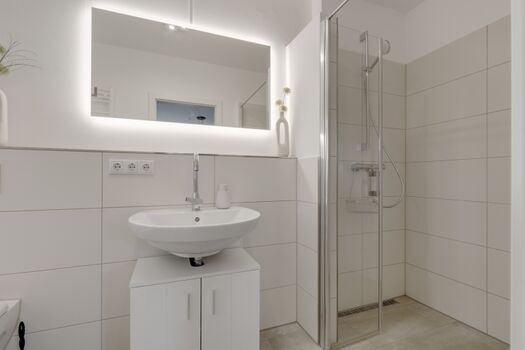 Das moderne, helle Badezimmer strahlt eine einladende Atmosphäre aus. Der Raum ist mit großen, lichtdurchfluteten Fenstern ausgestattet, die Tageslicht hereinlassen und eine frische, offene Stimmung schaffen. Die Wände sind in sanften, neutralen Farbtönen gehalten, was den Raum noch geräumiger wirken lässt. In einer Ecke des Badezimmers befindet sich eine großzügige, ebenerdige Dusche. Sie ist mit gläsernen Wänden ausgestattet, die einen klaren Blick auf die modernen Fliesen im Innenraum bieten. Gegenüber der Dusche steht eine elegante Toilette, die in ein minimalistisches Design integriert ist. Neben der Toilette befindet sich ein stilvolles Waschbecken, das auf einem schlichten, aber modernen Waschtisch montiert ist. Das Waschbecken ist aus hochwertigem Material gefertigt, und die Armatur hat ein zeitgemäßes Design, das den modernen Look des Bades unterstreicht. Über dem Waschbecken hängt ein großer Spiegel, der den Raum optisch vergrößert und das Licht reflektiert. Der Spiegel ist mit einer angenehmen LED-Beleuchtung umrahmt, die ein sanftes, gleichmäßiges Licht für persönliche Pflege bietet. Zusätzlich sorgen ausgewählte Dekorationselemente, wie frische Pflanzen oder stilvolle Handtuchhalter, für eine gemütliche und harmonische Atmosphäre. Waschbecken, Fenster im Bad, Fliegengitter
