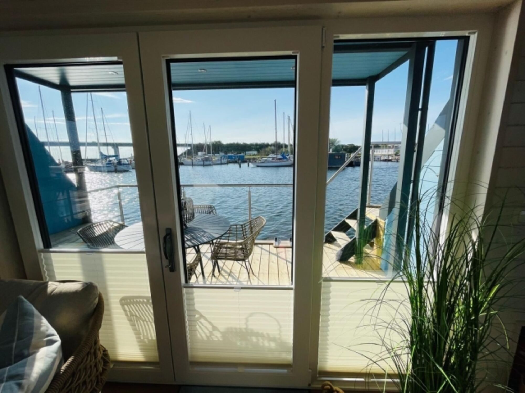 Das Hausboot Lillemor liegt mit einem Rundumblick über Hafen und Meer im Yachthafen Burgtiefe auf Fehmarn.