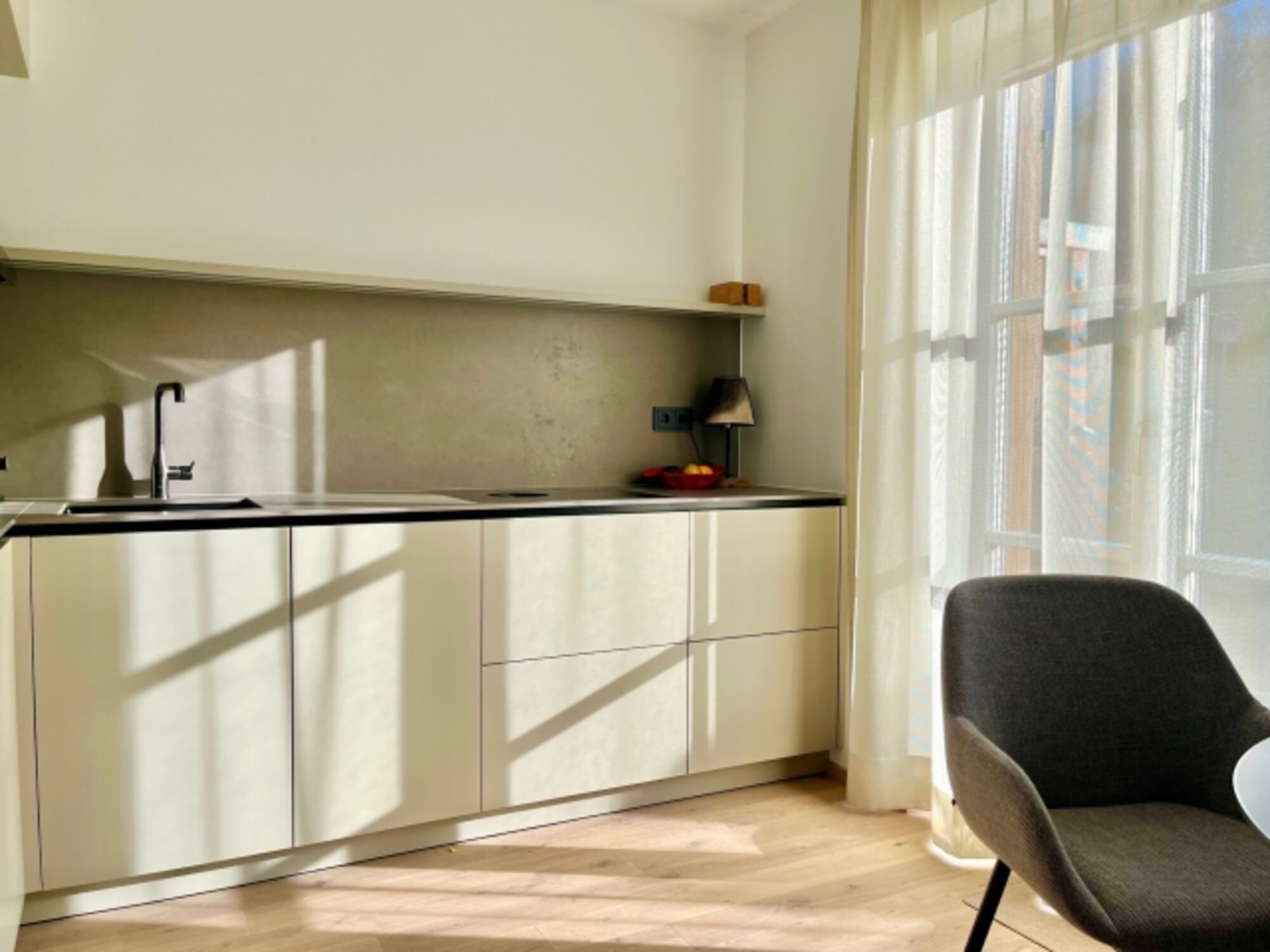 Gebaut, als wär’s unser Heim, erwartet Sie eine ebenerdige, stufenlos zugängliche Wohnung mit maßgefertigten Schreinereinbauten, großen Natursteinfliesen, Holz-Dielenparkett, Nordischer Sauna mit Infrarot und wechselndem Farblicht, großen Fensterflächen zur 18 qm große Süd-Terrasse, und für Ihren PKW bis 2 m Höhe ein kostenloser TG-Stellplatz. Ein Lift bringt Sie von der Tiefgarage trockenen Fußes zur Wohnung im Erdgeschoss.