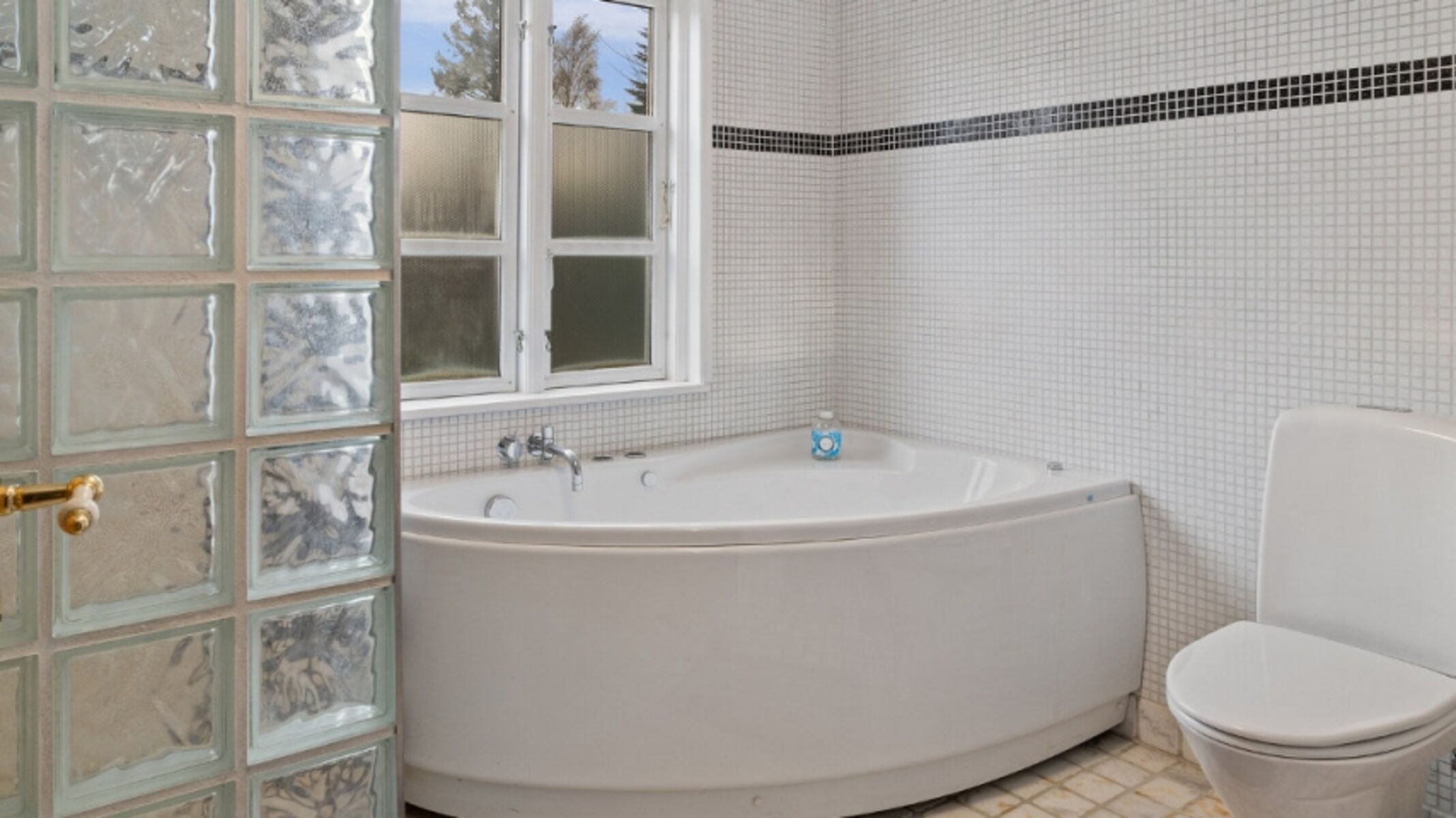 Badewanne mit Whirlpool, Waschbecken, Spiegel, Fenster im Bad