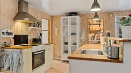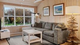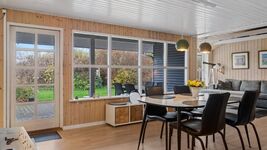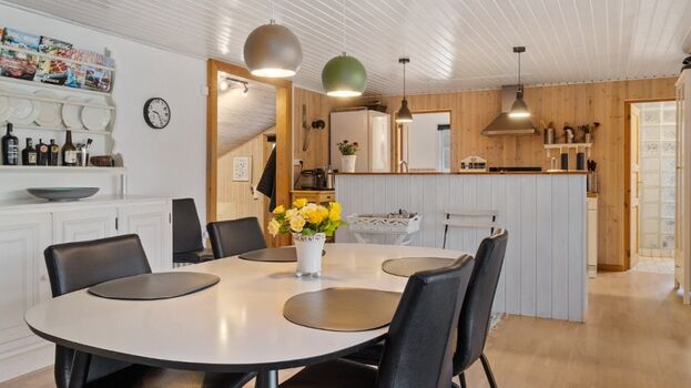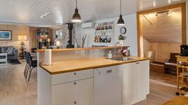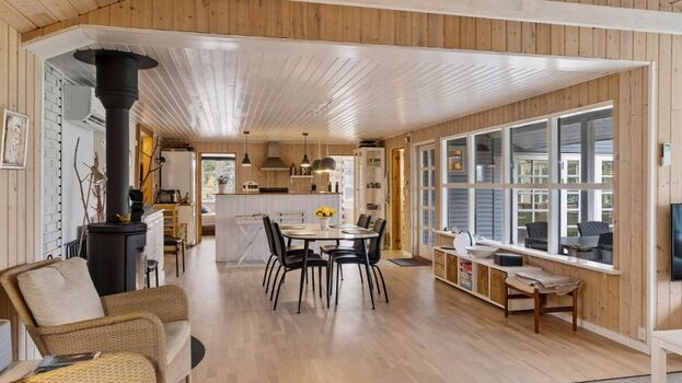 Im Inneren erwartet Sie ein einladendes Ambiente mit hellen Holzelementen, großen Fenstern und einer geschmackvollen Einrichtung. Der kombinierte Wohn- und Essbereich ist der zentrale Treffpunkt, ausgestattet mit einer Sofaecke, TV und Kamin für entspannte Abende. Der Esstisch lädt zu gemeinsamen Mahlzeiten und geselligen Spieleabenden ein. In der offenen Küche mit moderner Ausstattung können kulinarische Köstlichkeiten zubereitet werden.