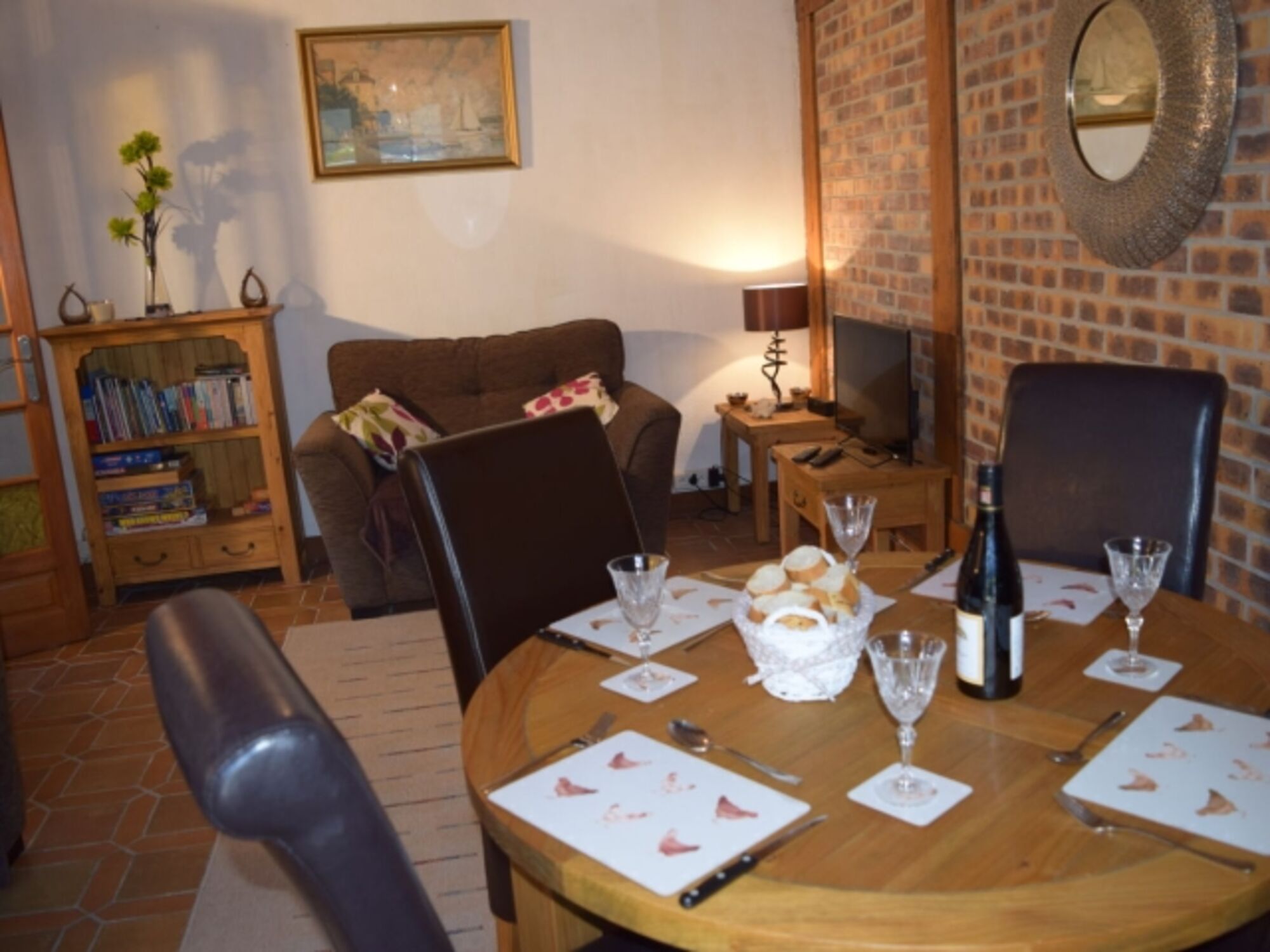Unser komfortables Wohnzimmer mit Mehrkanal-TV und einem Essbereich für 4 Personen blickt durch Doppeltüren auf den Außenterrassenbereich. Eine Auswahl an Brettspielen und Büchern steht Ihnen zur Verfügung. Es sind 3/4 Stufen zum Badezimmer im Erdgeschoss. Alle Treppen haben Handläufe und sind mit Teppich ausgelegt.