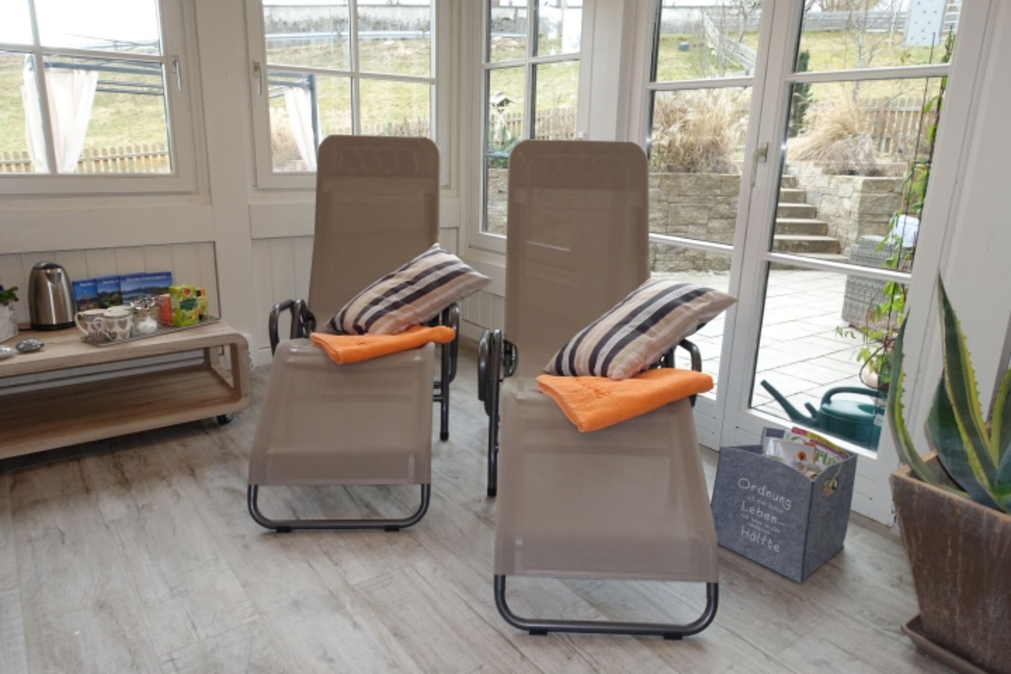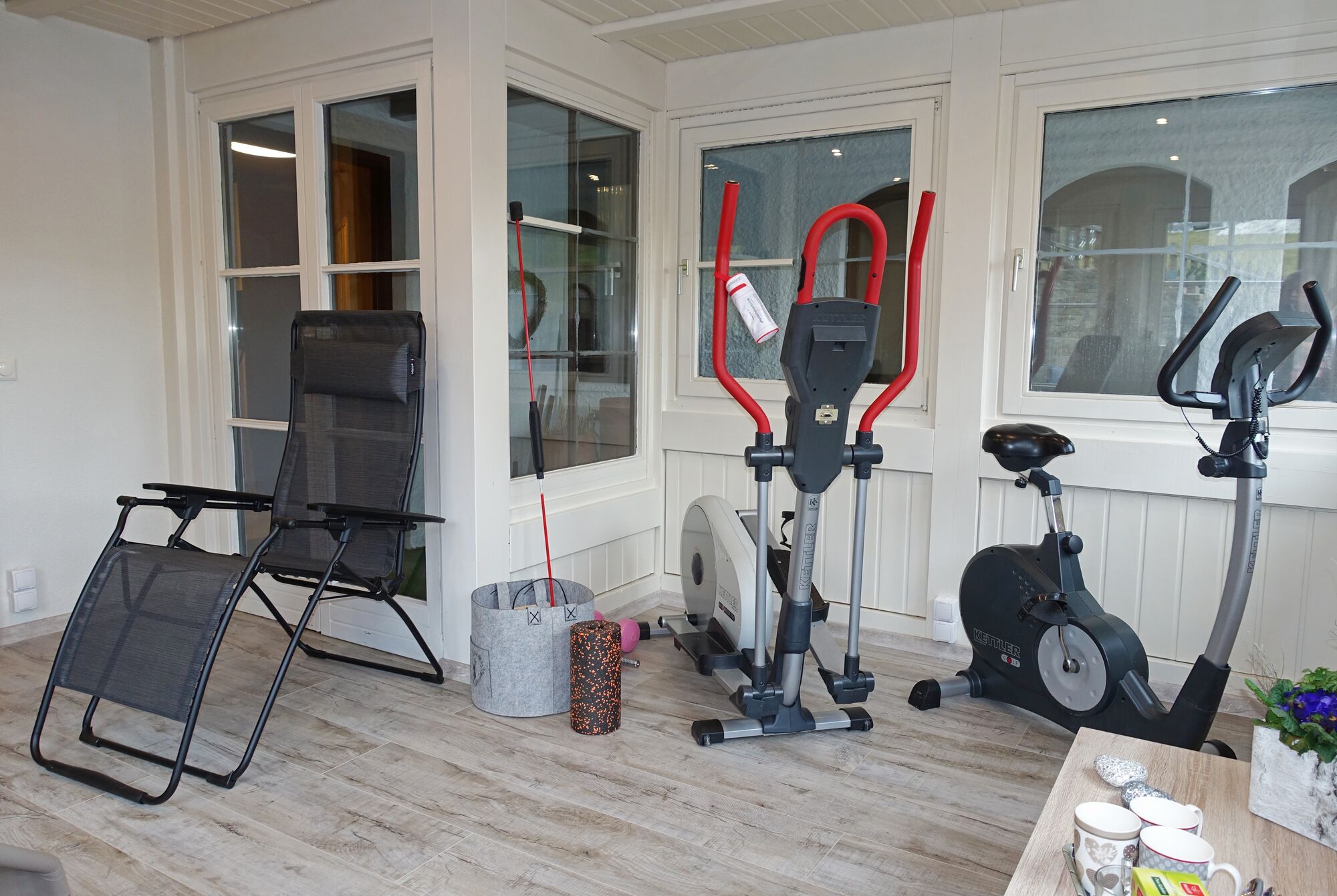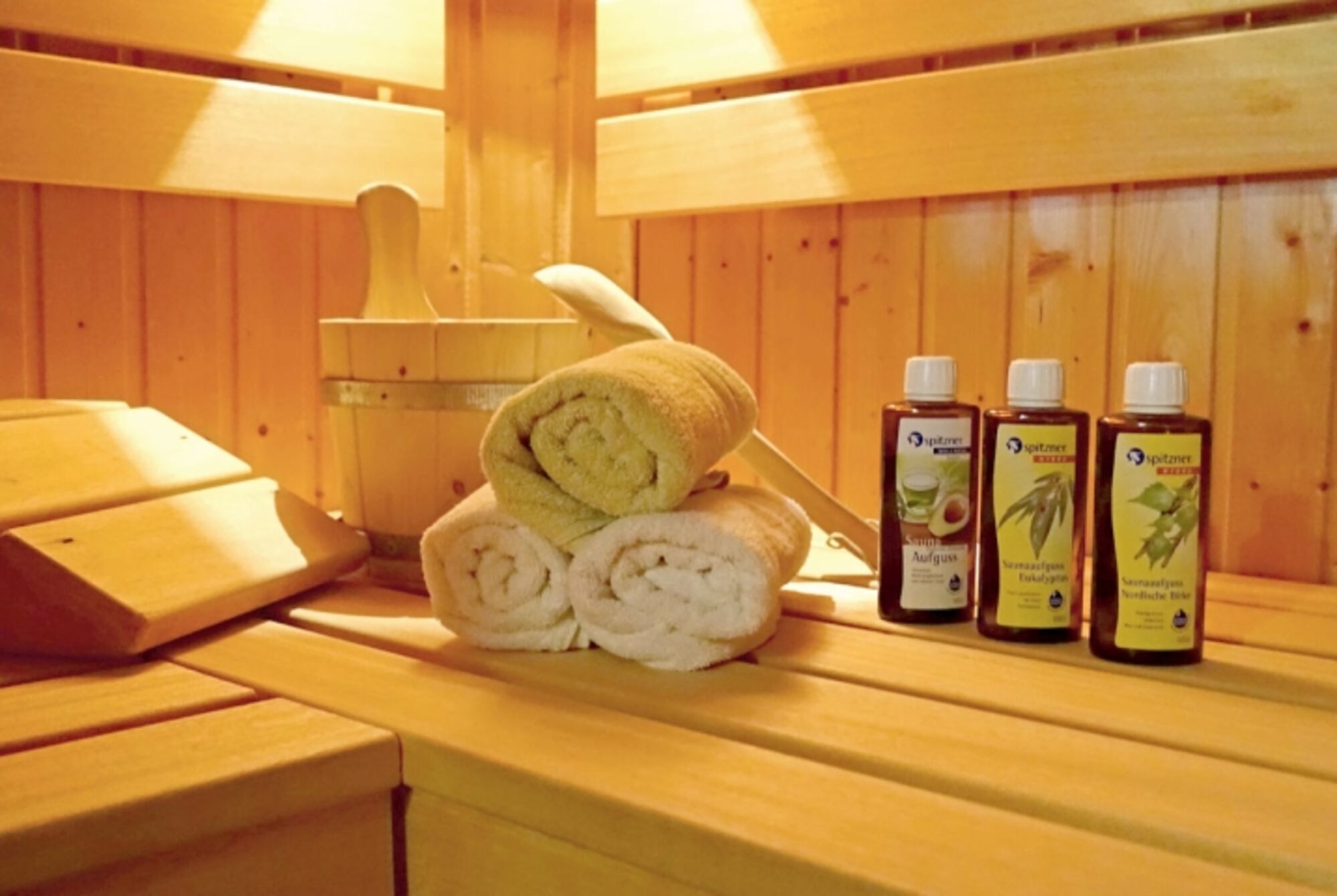 Wellness: Fitnessgeräte und Ruheraum mit Relaxliegen, Finnische Sauna mit Aufgussdüften, Massagen (kostenpflichtig), 4,5 m Aufstellpool im Sommer.
