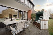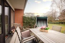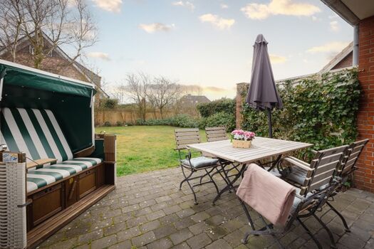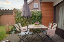 Die private Terrasse der Ferienwohnung lädt im Freien zum Entspannen ein. Genießen Sie die frische salzhaltige Luft, während Sie auf einer der Sonnenliegen relaxen oder die Mahlzeiten im Freien an den Gartenmöbeln genießen. Der Garten bietet einen wunderschönen Platz zum Sonnenbaden und ist umgeben von einem blühenden Sichtschutz, der Ihnen die nötige Privatsphäre bietet.