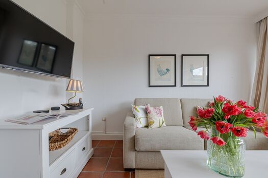 Mit einem großzügigen Wohnzimmer, das einen offenen Raumkonzept aufweist, lädt die Ferienwohnung dazu ein, sich auch drinnen wohlzufühlen. Zu den Annehmlichkeiten gehören eine moderne Küche mit Induktionsherd, Backofen und einer praktischen Spülmaschine – perfekt, um Ihre Lieblingsgerichte zuzubereiten. Die Sofaecke bietet Ihnen eine komfortable Möglichkeit, nach einem langen Tag auf der Insel zu entspannen, während Sie gemütliche Fernsehmomente mit einem digitalen Anschluss an Ihrem 44-55 Zoll großen TV genießen können.