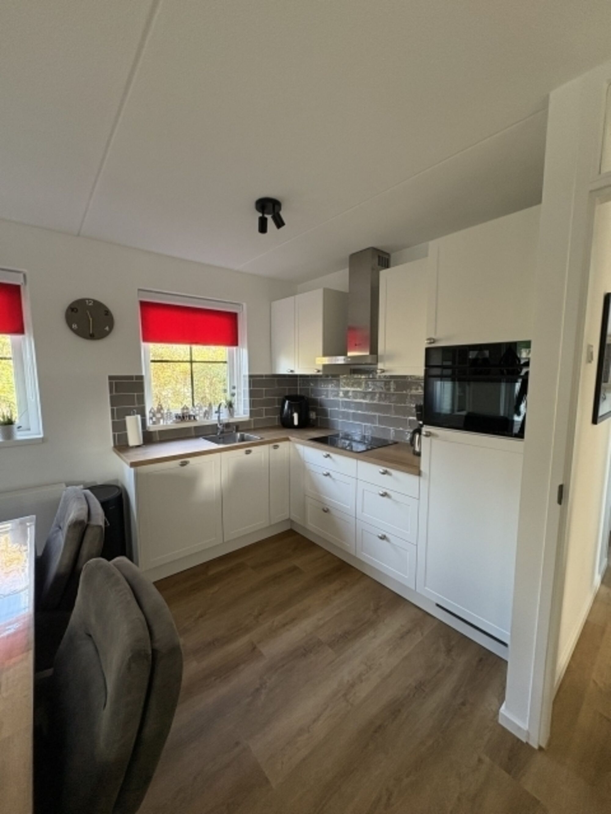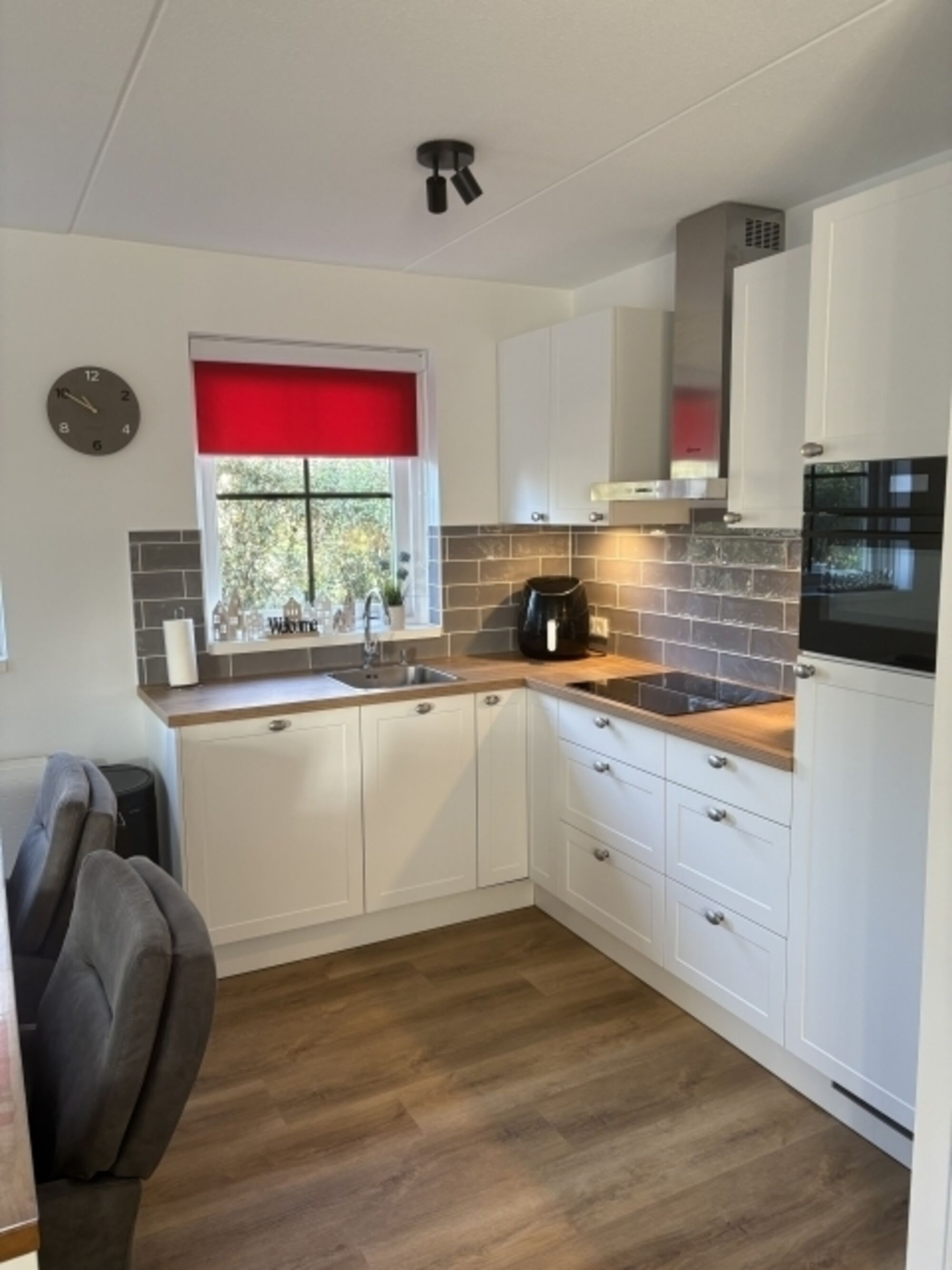 Induktionsherd, Dunstabzugshaube, Kühlschrank mit Gefrierfach, Eierkocher, Korkenzieher / Flaschenöffner, Gewürze (Salz, Pfeffer, Zucker), Öl / Essig