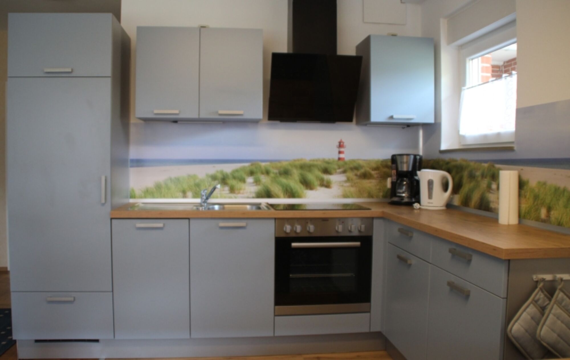 4-Platten Herd, Cerankochfeld, Dunstabzugshaube, Kühlschrank mit Gefrierfach, Eierkocher, Gewürze (Salz, Pfeffer, Zucker), Essplatz in der Küche