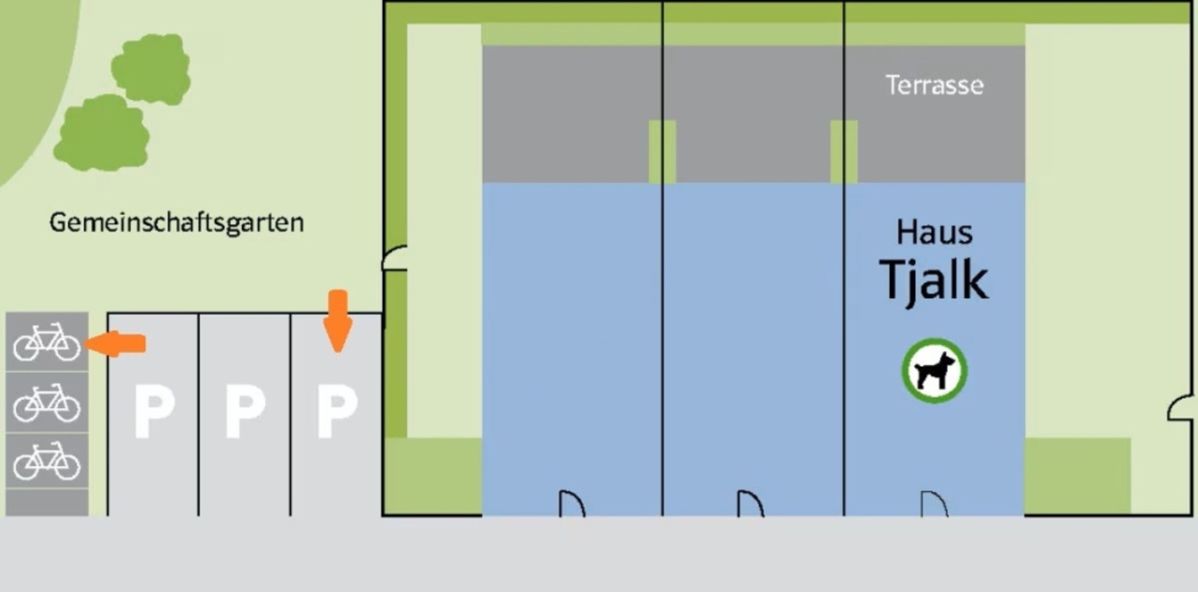 Zusätzlich zur Terrasse und dem Garten gibt es einen Gemeinschaftsgarten mit Obstbäumen, der mit genutzt werden kann.