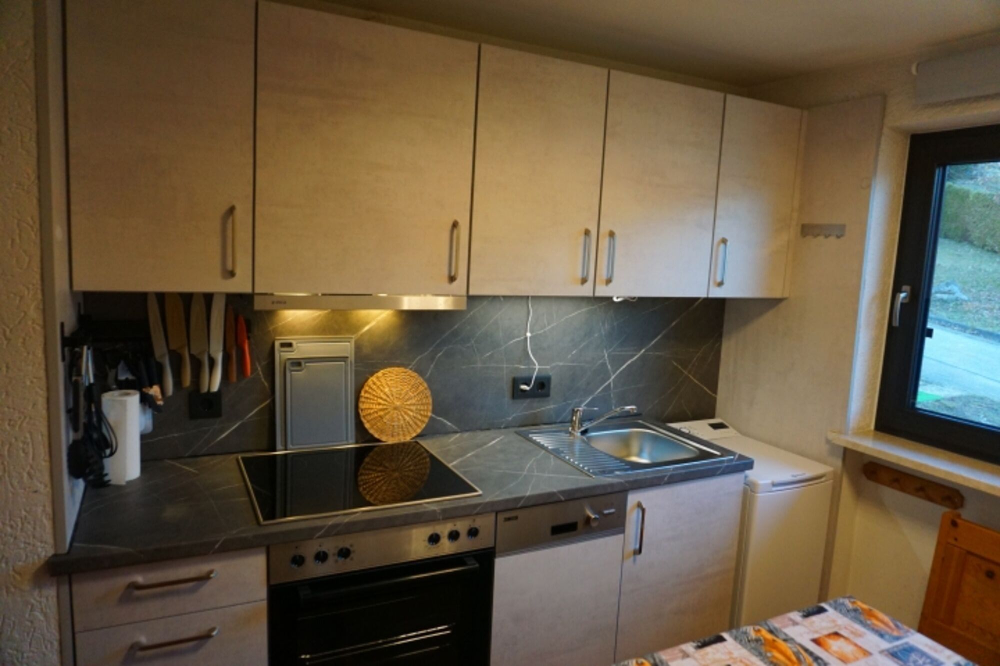 4-Platten Herd, Cerankochfeld, Dunstabzugshaube, Gefrierschrank, Senseo-Kaffeeautomat, Eierkocher, Korkenzieher / Flaschenöffner, Essplatz in der Küche