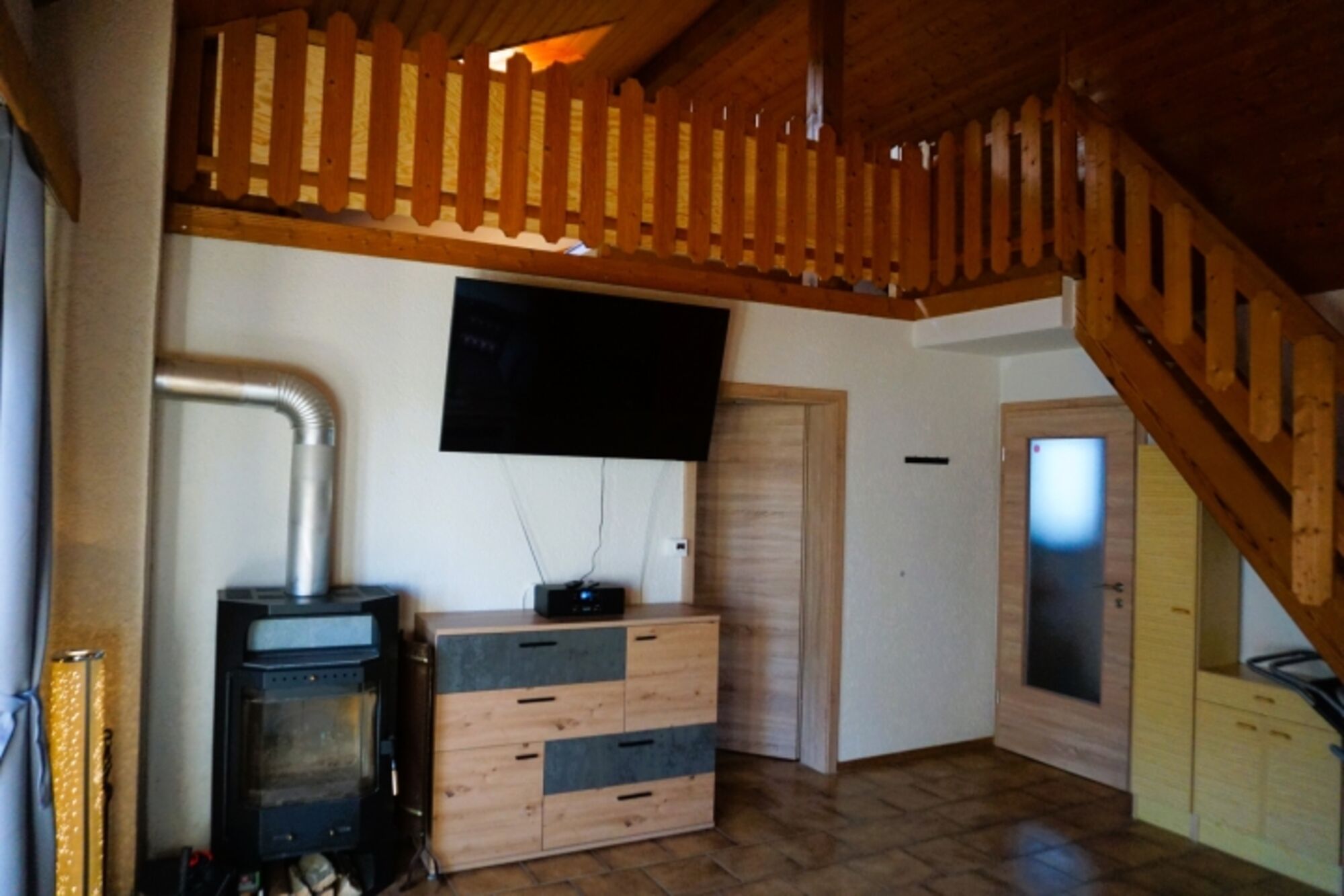 Das Schlafzimmer, hoch oben auf der Galerie, kann natürlich auf tagsüber zum Entspannen genutzt werden. Ein zusätzliches Schlafsofa kann hier genutzt werden. Doppelbett 1,80 x 2,00m, Einzelbett, Leselampe am Bett