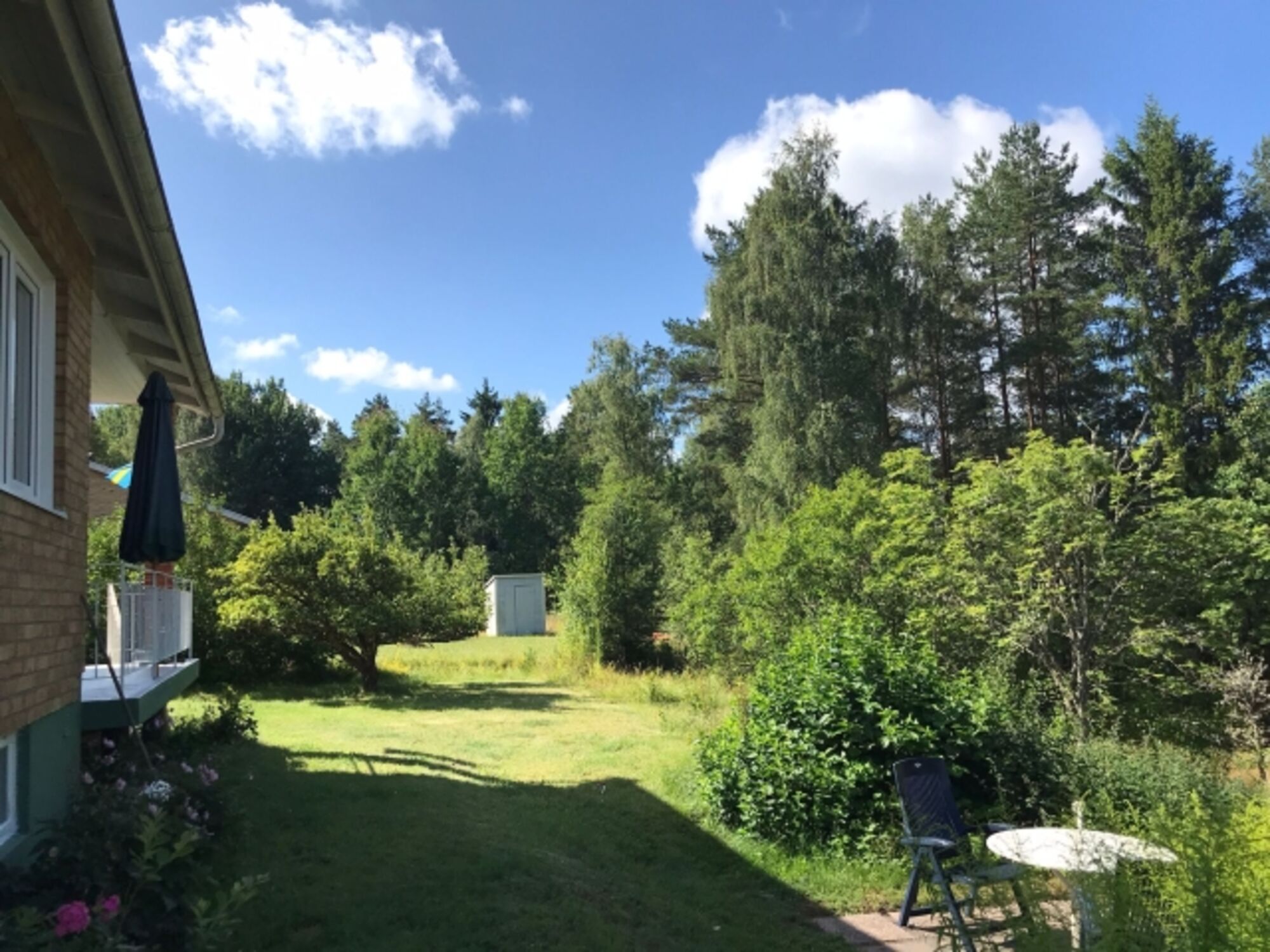 Das Haus liegt am Waldrand. Von Wohnzimmer, Küche, der Terrasse und dem Garten aus blickt man auf den Wald – es gibt jedoch keinen direkten Zugang, da das Grundstück insgesamt leicht abfällt und dort von einer Steinmauer begrenzt wird. Um in den Wald zu kommen, geht man etwa 100m den Zufahrtsweg nach Alsterfors hinunter.